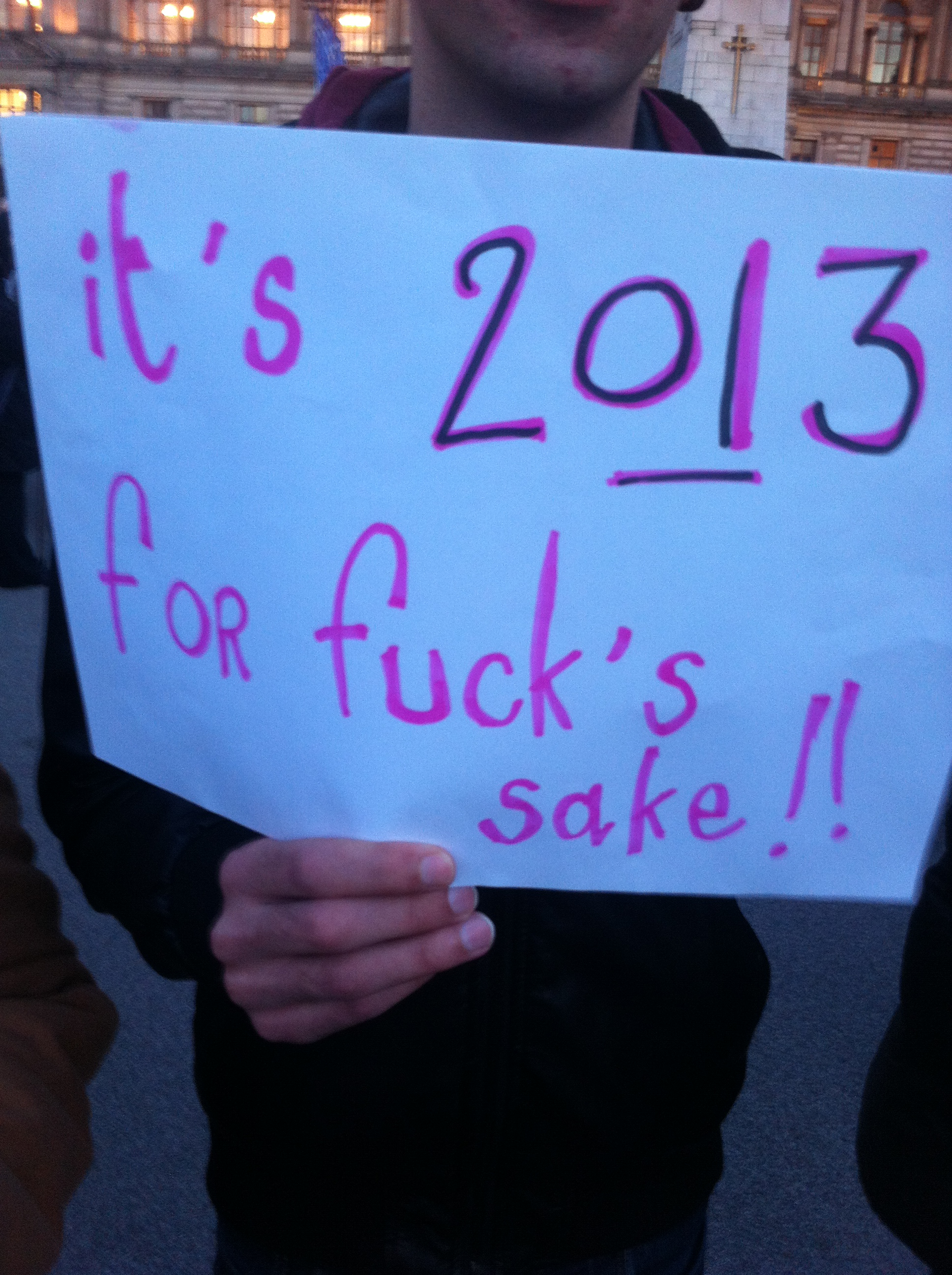 Some bright spark brought along blank paper and pens so that people could make their own placards. Without them it would probably just have been us surrounding their service and blaspheming. Oh, and having the occasional ‘debate’ with some of the whallopers from the other side, most of whom – surprise surprise – were horrible old men. So here come the pictures. First up is one such minging git, whose head you may or may not want to pour a pint over. Then it’s all good stuff.