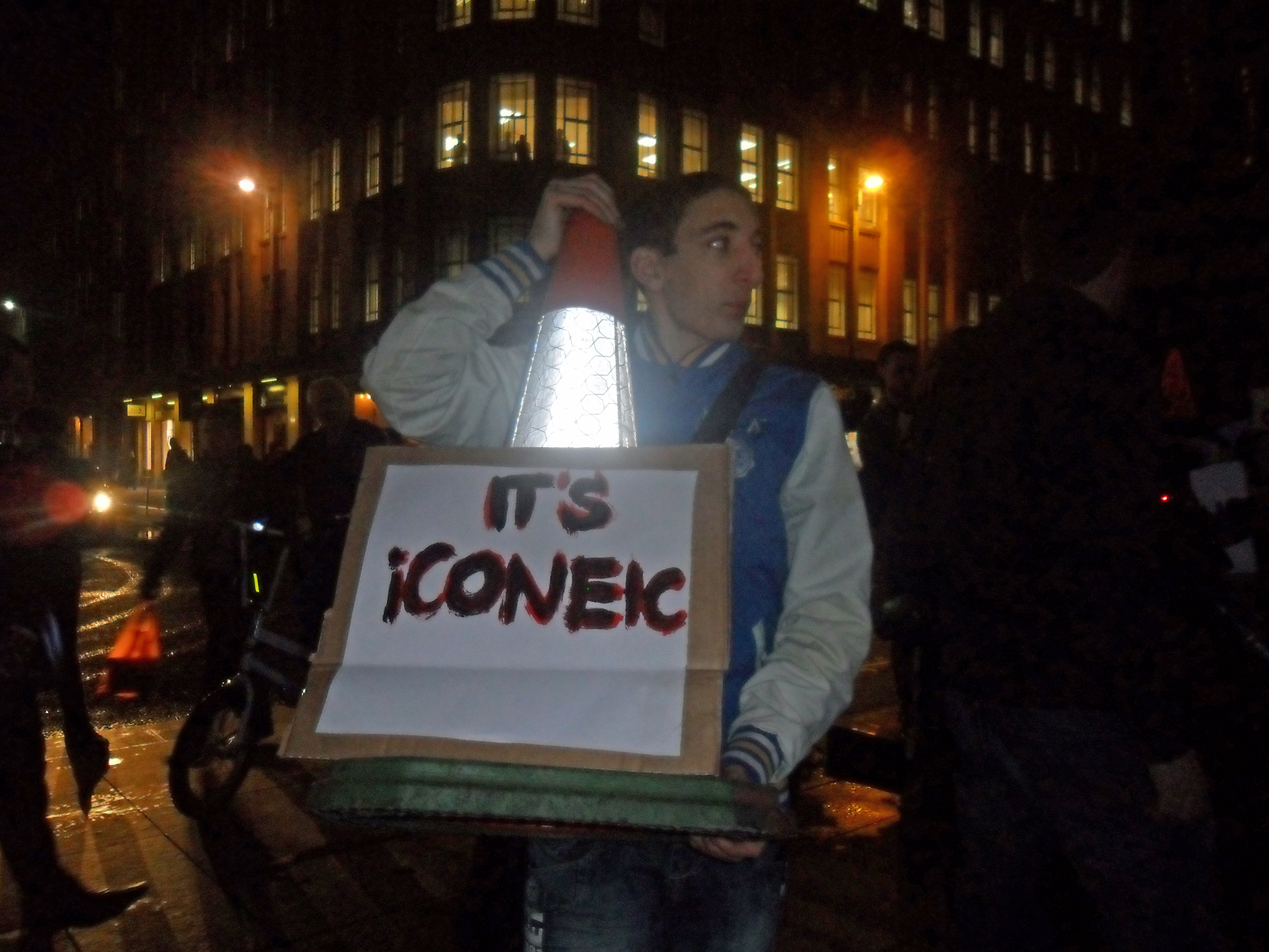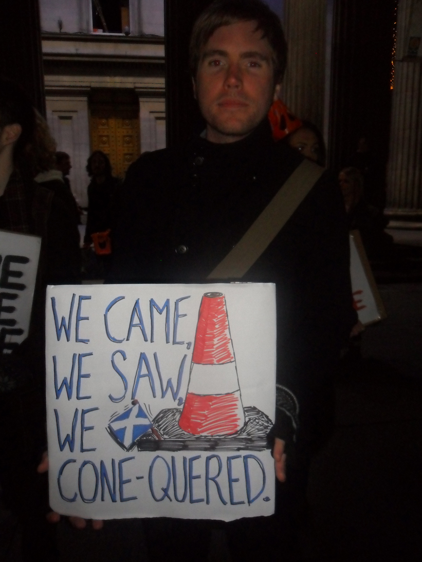 Not ones to kick the council when they’re down, it was decided that the anticipated protest would be transformed into a celebration of the Cone and of the peoples most glorious defence of it. No doubt, the many tens of thousands who clicked “like” on a Facebook group would have swelled the streets of our city tonight but since we’d basically already won (although the sleekit council waited until about half 4 to declare they may yet seek ways to impede the cone), it was a rather more low-key affair.