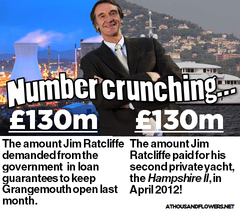 In case you were wondering, Jim Ratcliffe is the shadowy Bond villian-esque billionaire – with his two superyachts, beachfront mansion complex and petrochemical empire – behind Ineos, the multinational firm which bought out the Grangemouth refinery from BP in 2006. Having built Ineos up from nothing on the basis of asset stripping other businesses and ruthlessly cutting costs, the company were on a collision course with Grangemouth’s well organised workforce from the day they took over. Having been forced into a humiliating climbdown on pension changes after a two day strike in 2008, Ratcliffe was out for revenge. When an opportunity arose earlier this year to stick a dagger into Unite after their convenor at the plant, Stevie Deans, became embroiled in the Falkirk Labour candidate selection fiasco, it was seized upon. As the dispute escalated, it became clear it was less about whether one guy sent some emails from his work computer, and more about their shareholders (otherwise known as Jim Ratcliffe) wanting to continue their relentless drive to push up profits at the expense of everyone else. When enough workers didn’t volunteer themselves for wage cuts and worse terms, Ineos announced the whole plant was unprofitable and would have to close. Panic mode set in, the union capitulated, the government threw money at Ratcliffe and the jobs were saved.