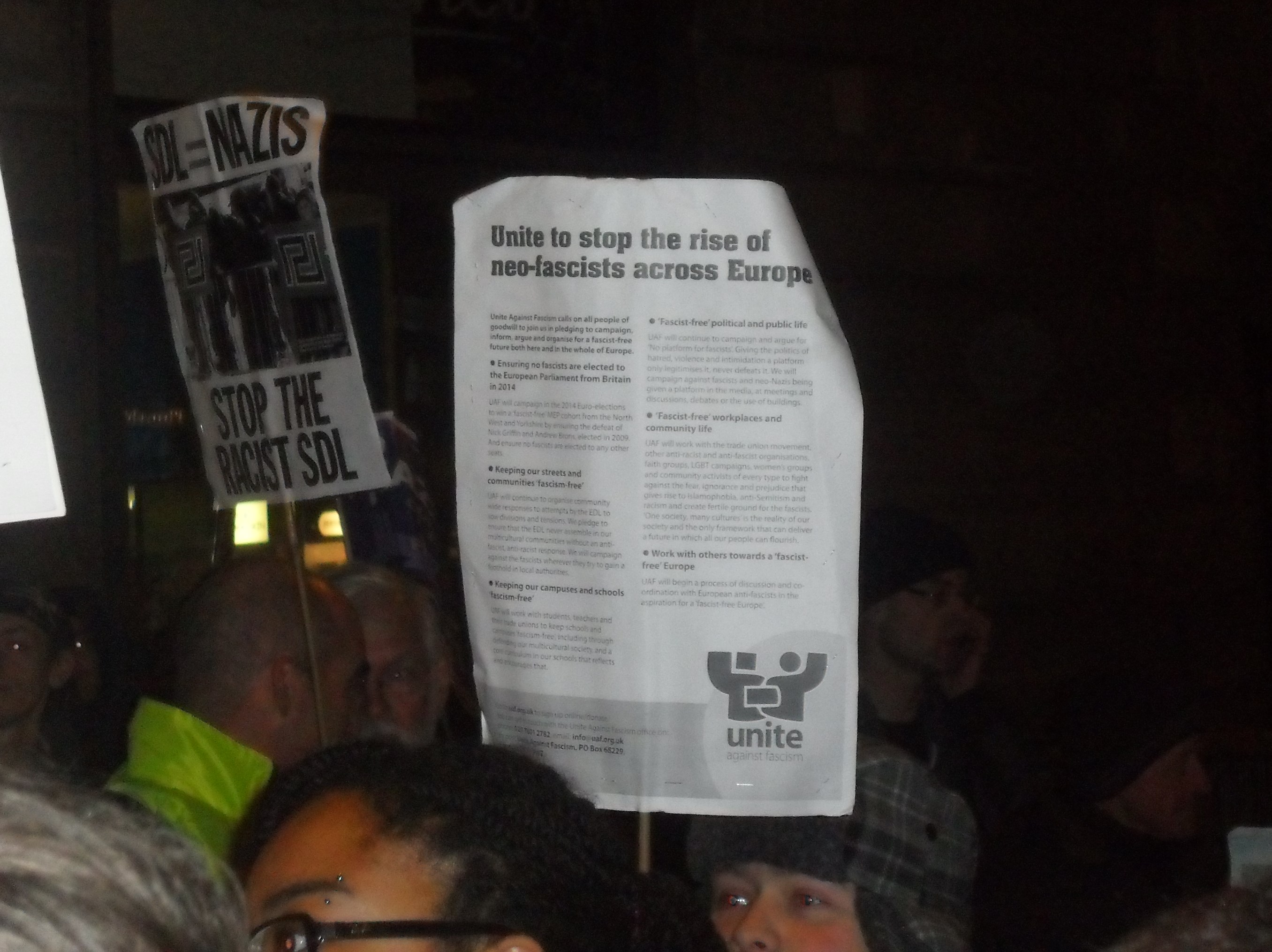 It’s fair to say the SDL weren’t particularly riled by the Nazi chants, with their Ian Paisley impersonator intoning that “I think you’ll find that you SNP supporters are the real Nazis” and launching into another boring monologue. Although it’s true that skinhead elements have flirted with them in the past, the bulk of the SDL’s “ideology” stems from British nationalism, tabloid anti-immigrant hysteria and loyalism rather than any allegiance to Nazism. Links to groups like the Golden Dawn are therefore pretty tenuous, although if you’d like more information on this subject I can refer you to the placard below, on which UAF have helpfully printed a complete history of facism 1922 -2014: