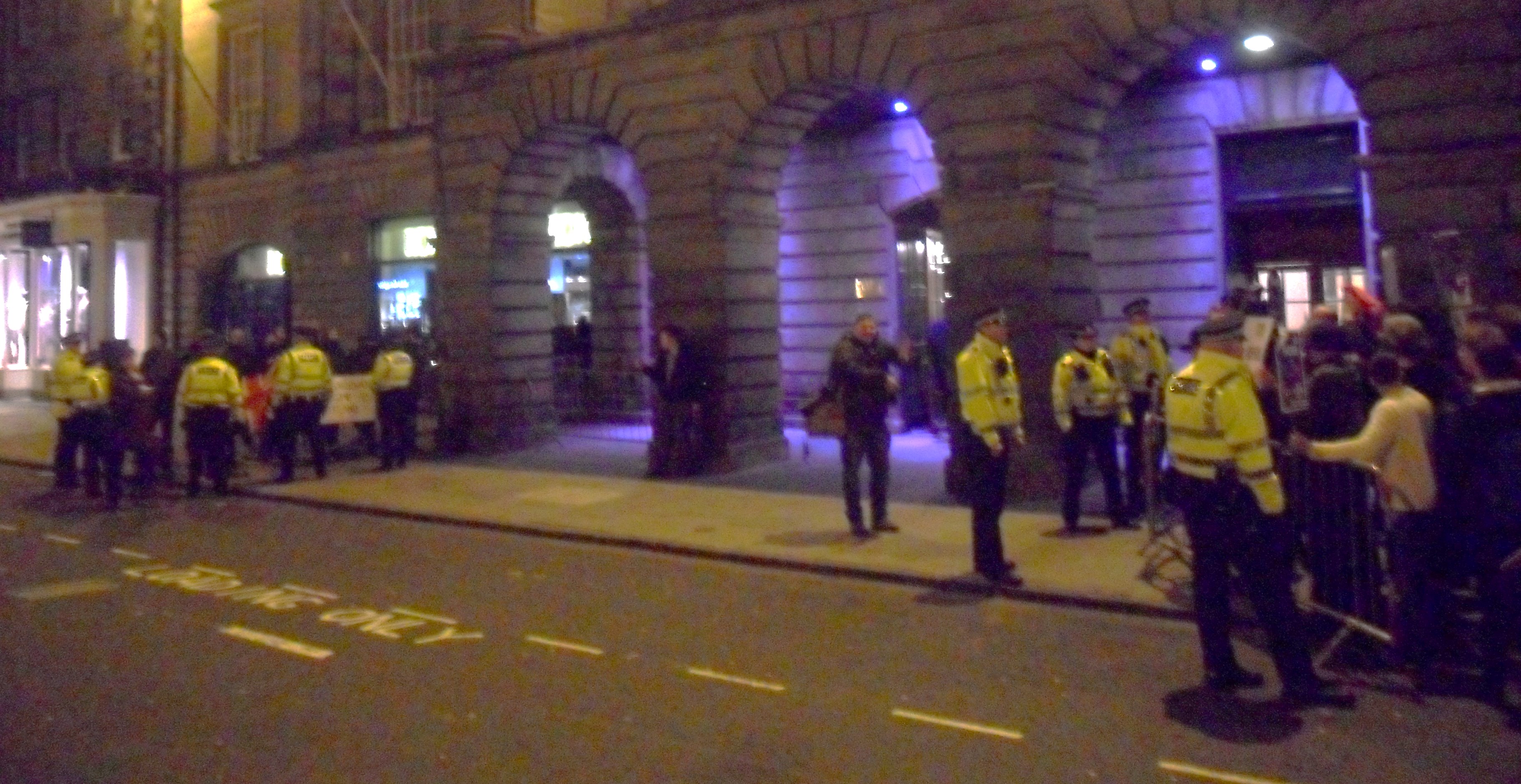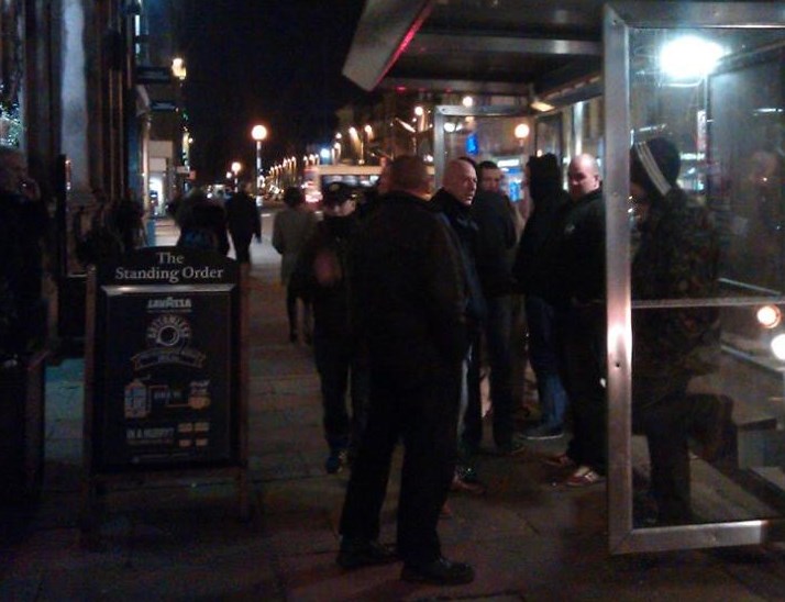 By this point the assorted Galloway minions, Yes leafleters and leftie paper sellers were gathering about 20 feet down the road at the Assembly Rooms, eyeing up the SDL and waiting for the moment when they might to decide to make a move. It didn’t take long, leading to a scuffle as all ten of them tried to march straight through the anti-fascist protest. Chants of “commie scum” and “Nazi scum” took over, but the Battle of Stalingrad this was not, as the police successfully persuaded the SDL that if they would just go over to their designated protest area at the other side of the doors, everyone would then be able to quietly get along/spend the rest of the night shouting threats at each other without any physical contact.