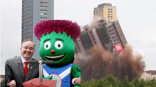 Glasgow City Council have finally entered a realm beyond parody. The council have an extensive back catalogue of recent PR fuck-ups, from the George Square debacle, Ronnie Saez’ £500k pay off, the new parks by-laws, to the infamous Wellington cone furore, but this surely tops them all. Far from being a delayed April Fools joke which was accidentally CC’d to the wrong people, the games opening ceremony really will be built around… demolishing council houses.