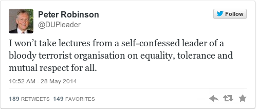 You’ll be shocked to hear that for Peter Tolerance Robinson, this is far from the first time that he has made and defended statements that clearly cross the line from being whiney free speech to full blown hate speech. You might remember that back in 2008 there was a pretty horrendous homophobic attack in Newtownabbey, and true to form, instead of immediately condemning a brutal hate crime, Big Cunt Peter (I’ve ran outta insults, OK) decides to big up his MP wife Iris Robinson, whose response to a gay fella being left for dead was to recommend a psychiatrist “to help homosexuals trying to turn away from what they are engaged in”. I shit you not. Even the PSNI investigation concluded that her comments breached hate crime laws! Parochial Pete’s reaction was “It wasn’t Iris Robinson who determined that homosexuality was an abomination, it was THE ALMIGHTY“.Jesus fucking Christ. (Two weeks later the same bam states IN PARLIAMENT that homosexuality is “viler” than child sexual abuse. Just. What.)