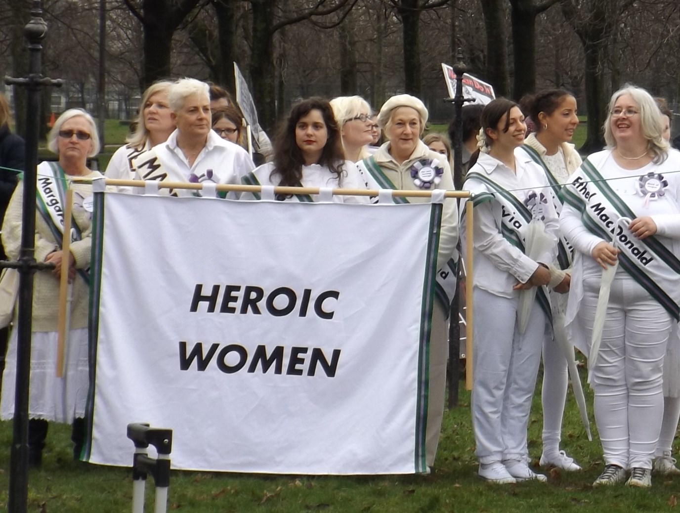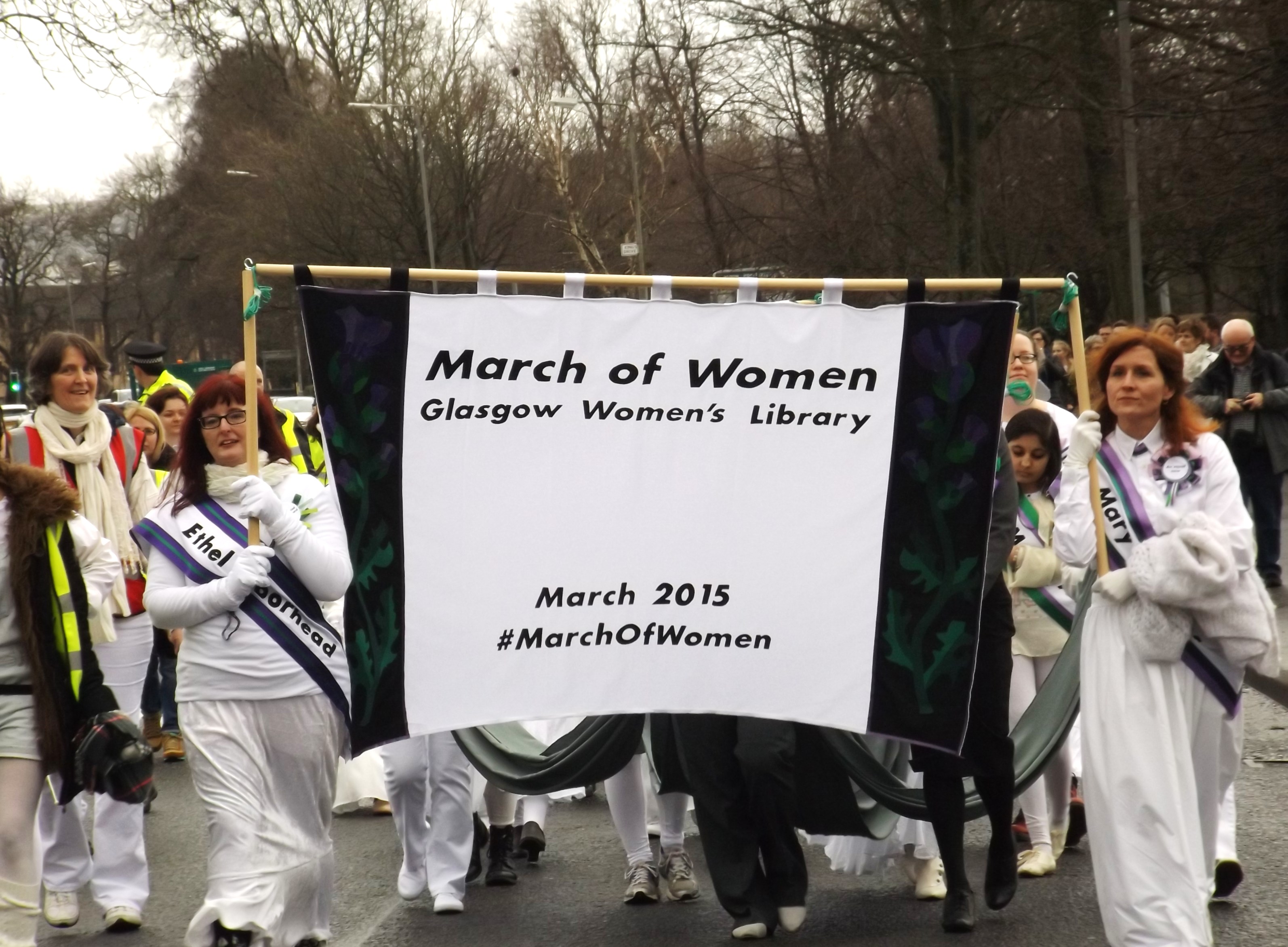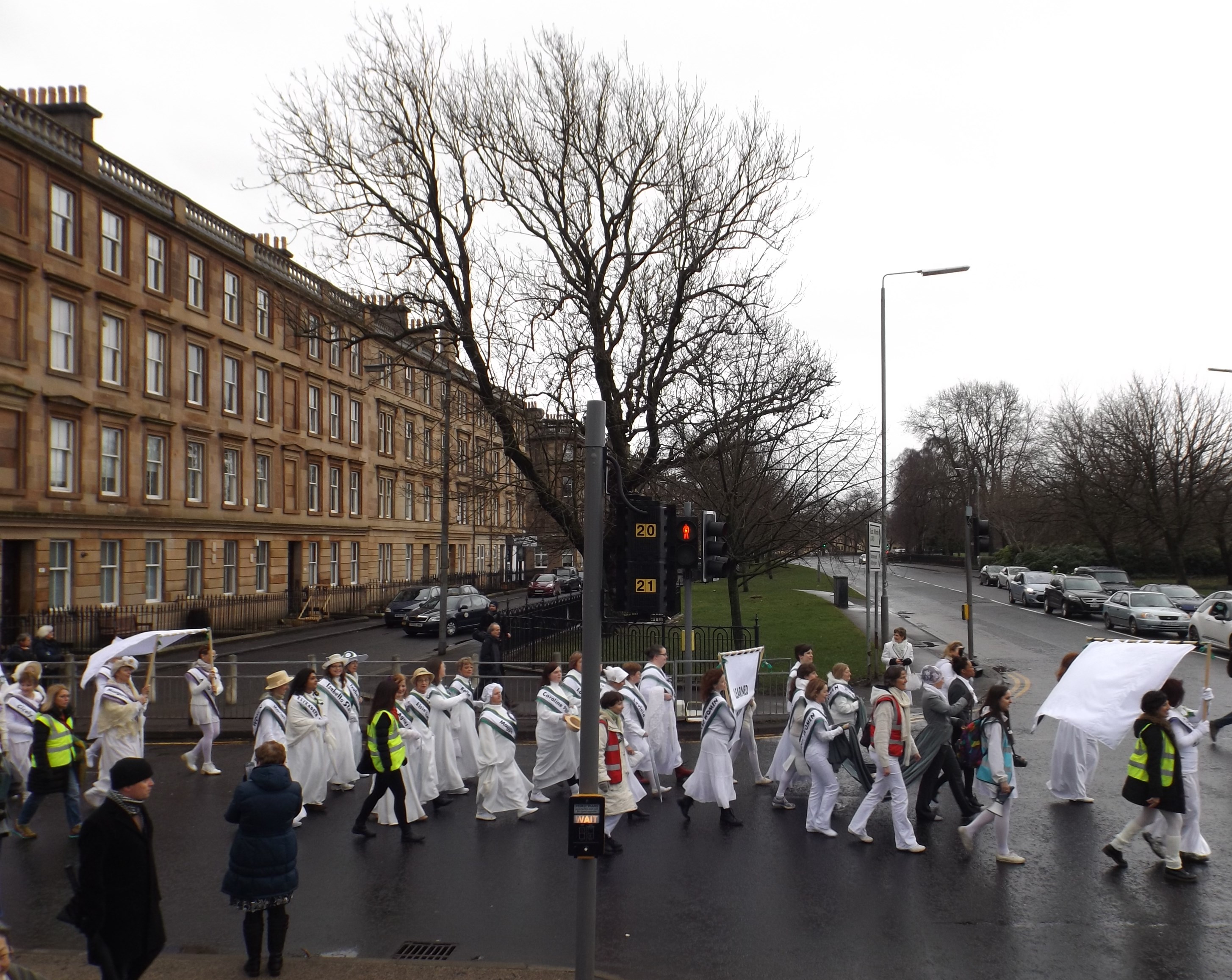 It’s 101 years since suffragettes tried to blow up the Kibble Palace in Glasgow’s Botanic Gardens, as part of their militant campaign to win women the vote. There was little sign of any explosives this afternoon though, as several hundred women and supporters – many dressed as suffragettes – marched through the east end and culminated near Glasgow Green to mark International Women’s Day. At the time of writing, the glasshouse at the People’s Palace remains firmly intact.