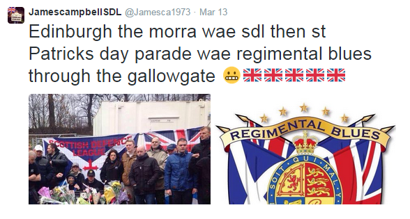 While the arrival of PEGIDA Scotland in Edinburgh next weekend will inevitably spark a media frenzy, much the same bigots marched through Glasgow today with the explicit intention of riling up the Irish community and there has barely been a murmur of dissent. For anyone doubting the links between these organisations, check out the charming James Campbell, who we believe works for the council, and his public social media posts below: