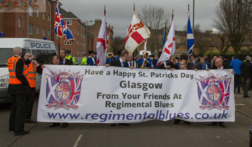 It may be a surprise to Jim to hear that there was a St Patrick’s Day parade through Glasgow city centre today, yet there wasn’t a tricolour or oversized Guinness hat in sight. Rather, the parade was being held by extremist loyalist faction the Regimental Blues – and what’s more, it had been fully sanctioned by Labour-run Glasgow City Council. Incredibly, the march had been allowed to go ahead on the same afternoon as the Scottish League Cup final, with Celtic taking on Dundee United at Hampden, and passed several packed Celtic pubs on its route near the city’s Gallowgate.