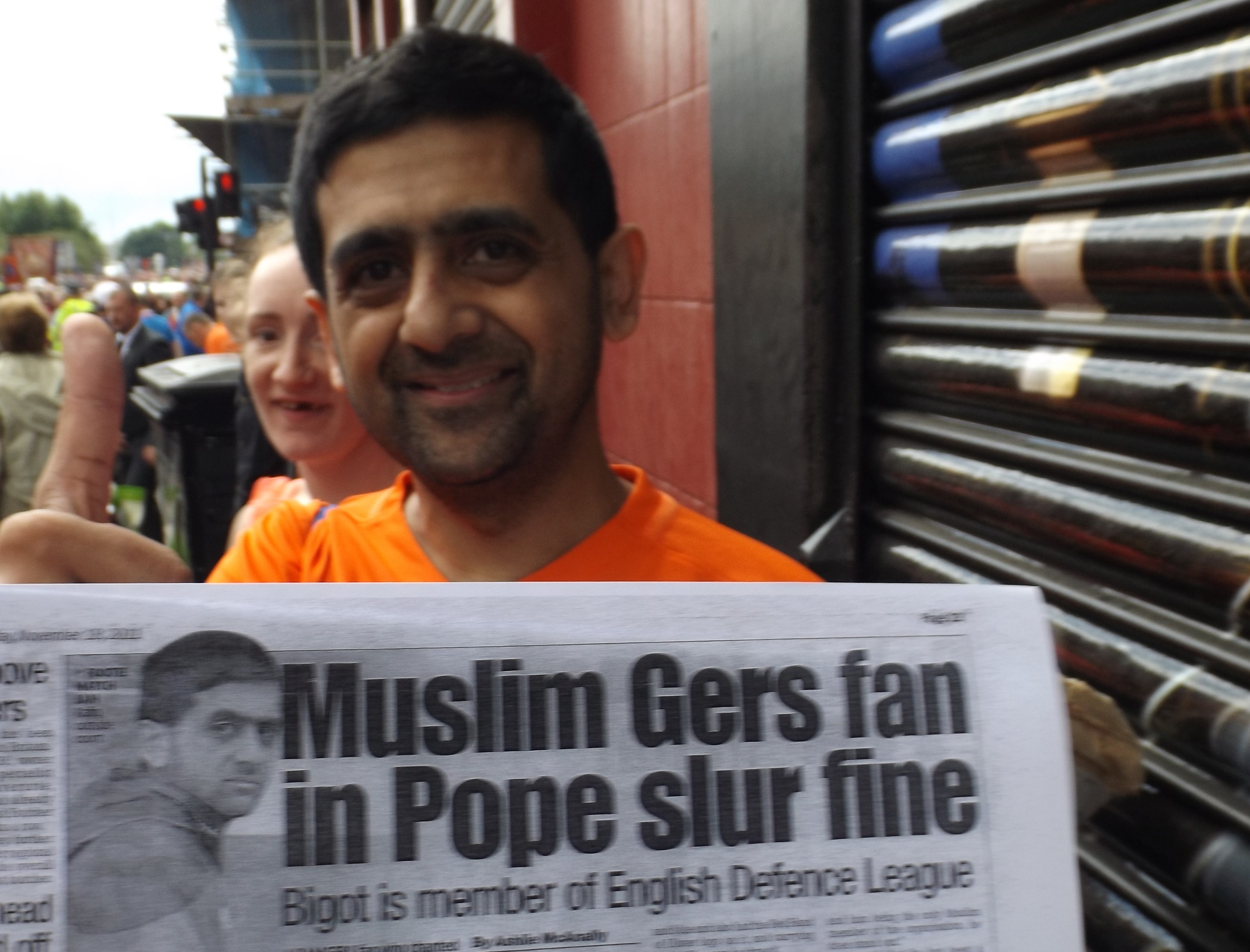 This is the famous “EDL Abdul”, who was standing on the Saltmarket handing out photocopies of a 2011 Daily Record clipping from the time he got a £600 fine for shouting “Fuck the Pope” at Ibrox. “It’s about me,” he explained while handing me a copy.