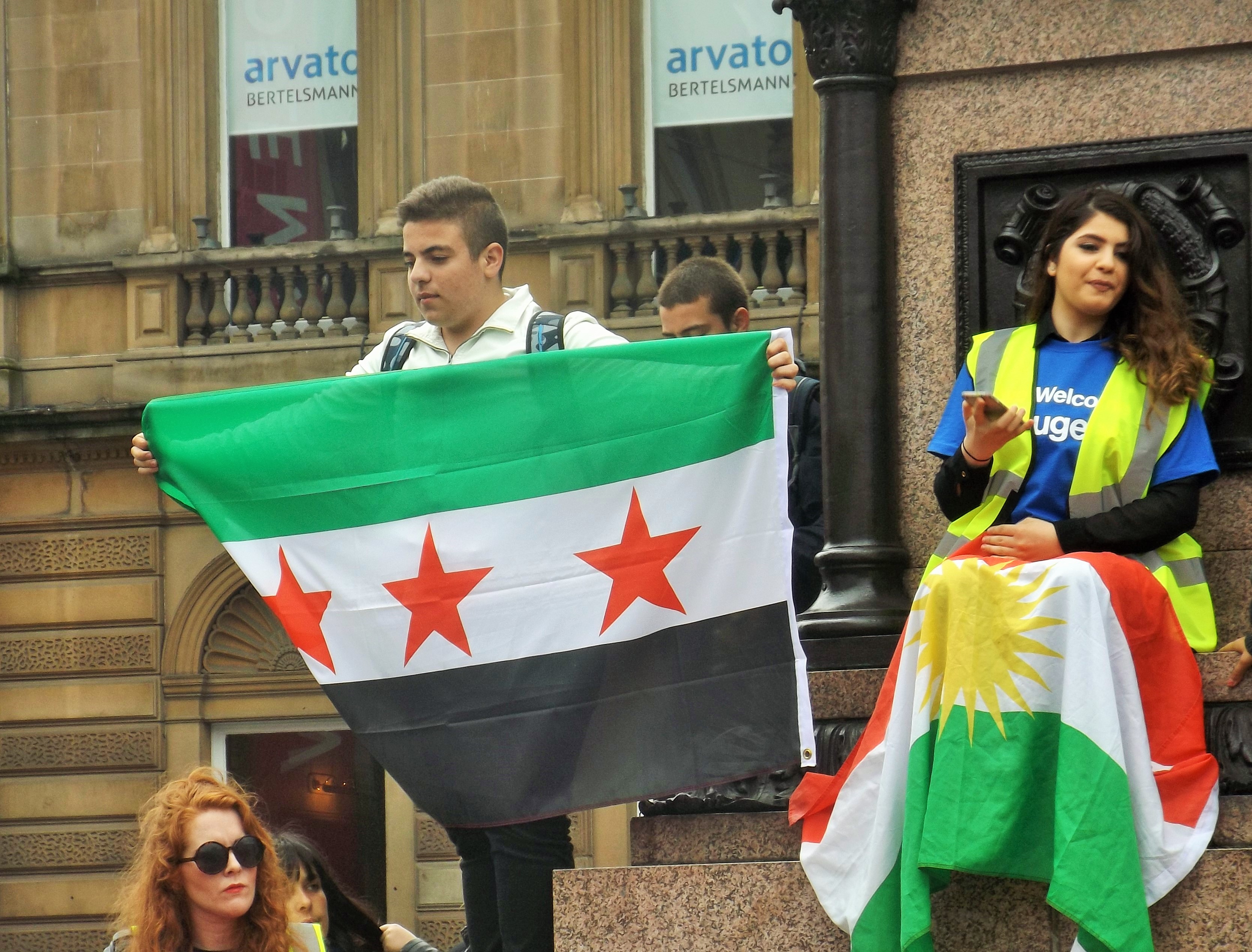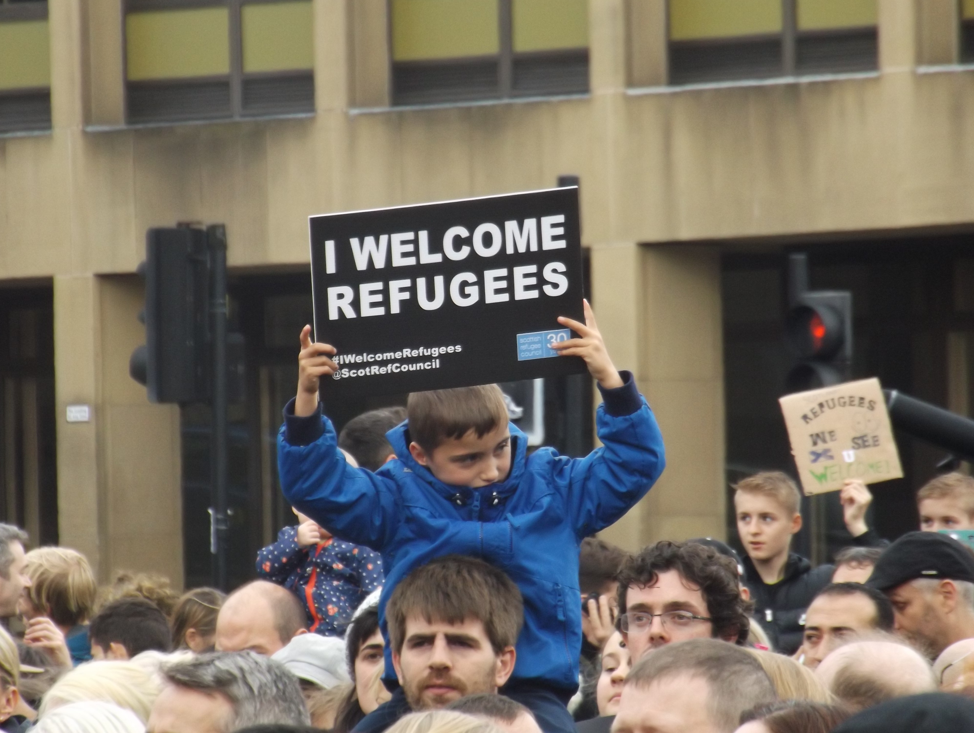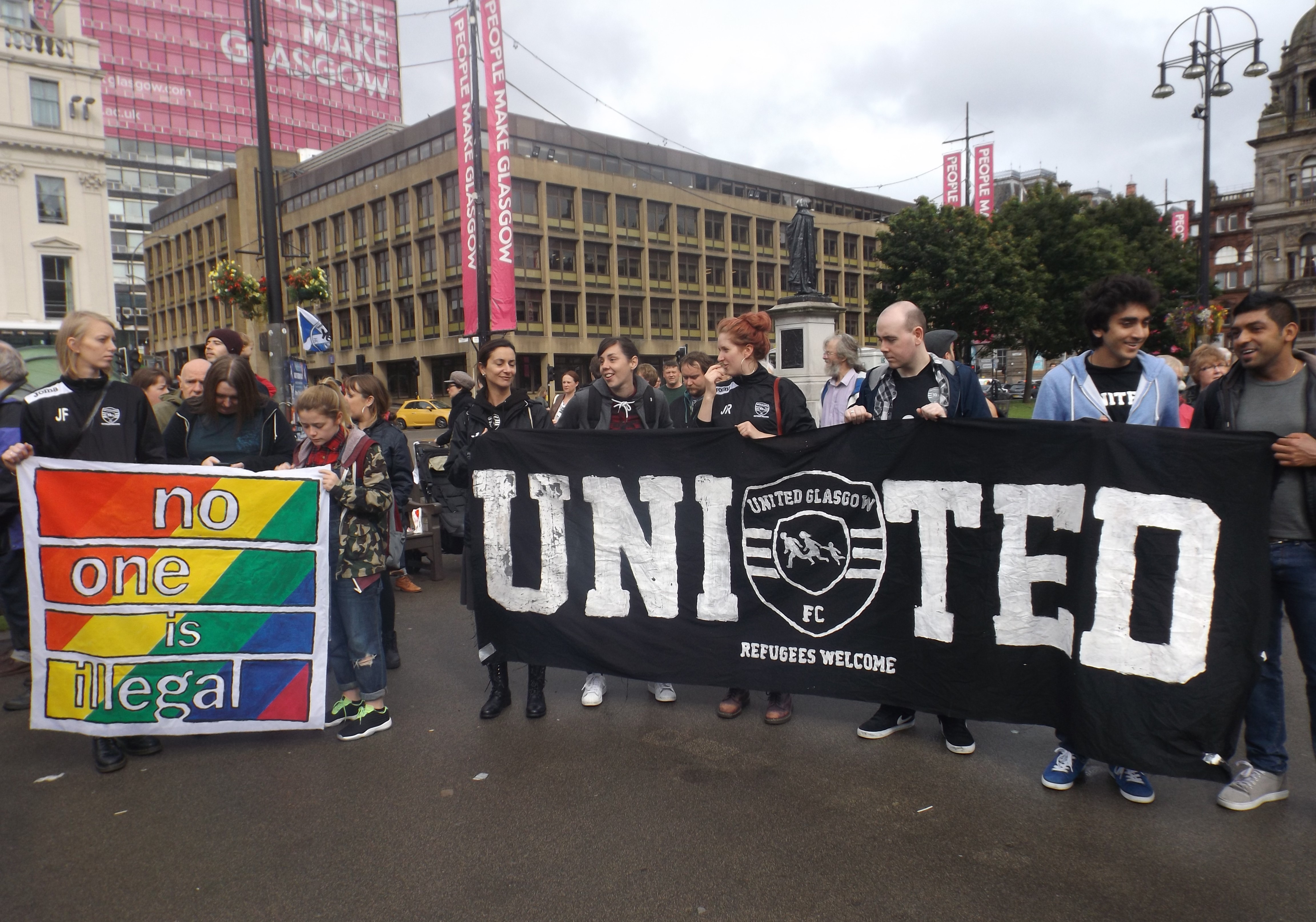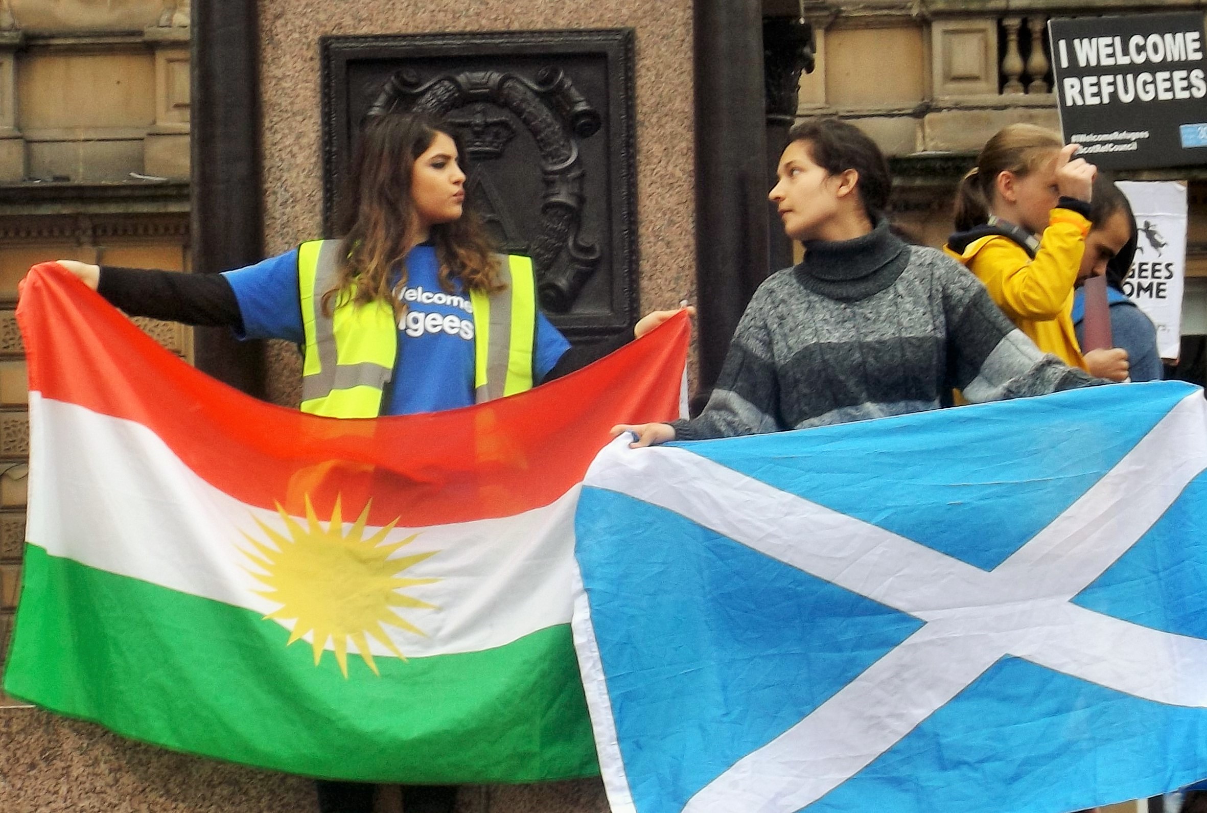 Several thousand people, dugs and weans packed into George Square today for the Glasgow Sees Syria rally. Organised independently through social media over the past few weeks, the demonstration called on the UK Government to do more to help those fleeing war and destitution elsewhere, It was also an important show of solidarity with refugees – particularly in the face of alarming anti-refugee and anti-immigration rhetoric which – while far from a recent development – has become alarmingly prevalent over the course of the recent crisis.