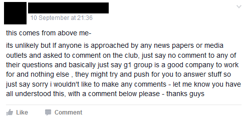 Days later, panicking bosses at G1 Group were already demanding that staff refuse to speak out. In a message posted to workers at the G1-owned Underground nightclub in Dundee, staff members were told to “just say g1 group is a good company to work for and nothing else” if approached. The full post by management at the club, who qualified that it “comes from above”, reads: