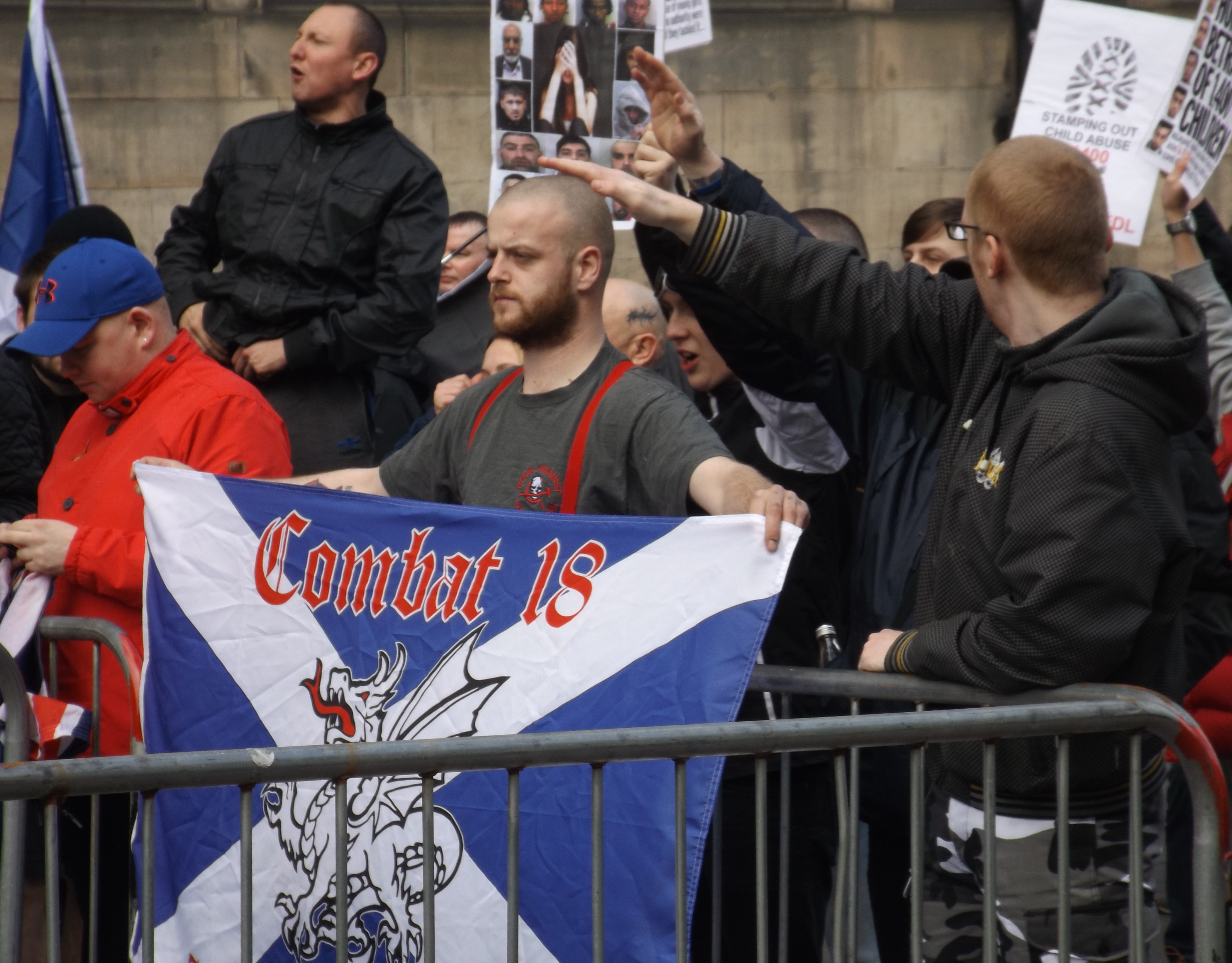 The SDL’s turnout was noticeably down on their last Edinburgh outing in October, although their numbers were boosted by a contingent from England of ex-EDL and ‘National Action’ supporters. As with last year’s demo, any suggestion that the SDL are pretending to be anything other than hardened neo-Nazis has been abandoned, with Combat 18 flags and sieg hail salutes on open display.