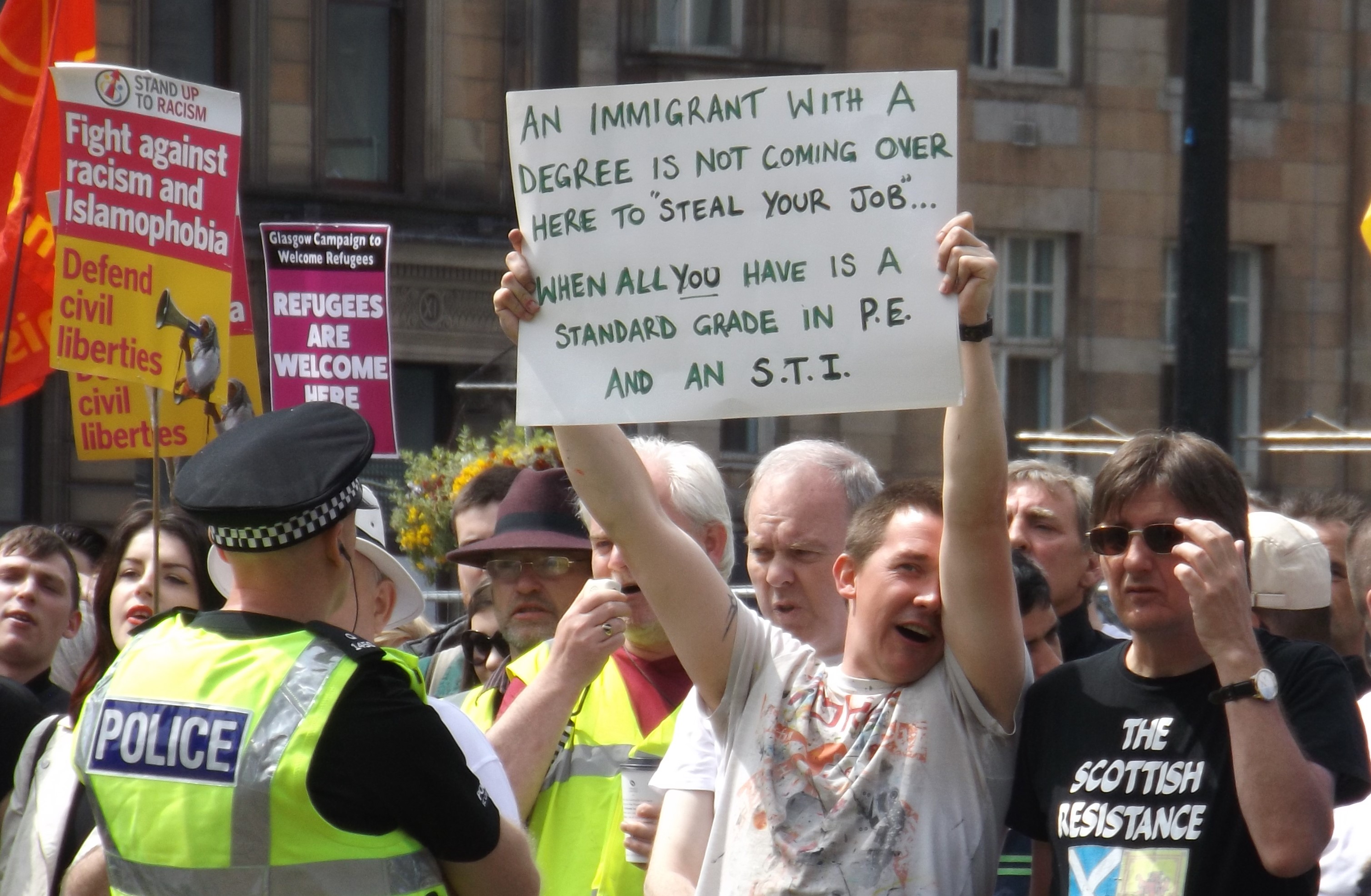 Unfortunately, the counter protest was tinged by a completely unnecessary snobbery, as illustrated by the “hilarious” placard below. There’s plenty of reasons to despise the SDL without attacking them over a perception that they’re just lacking the right number of Standard Grades. Haha stupid racists! Bet they all like football too!