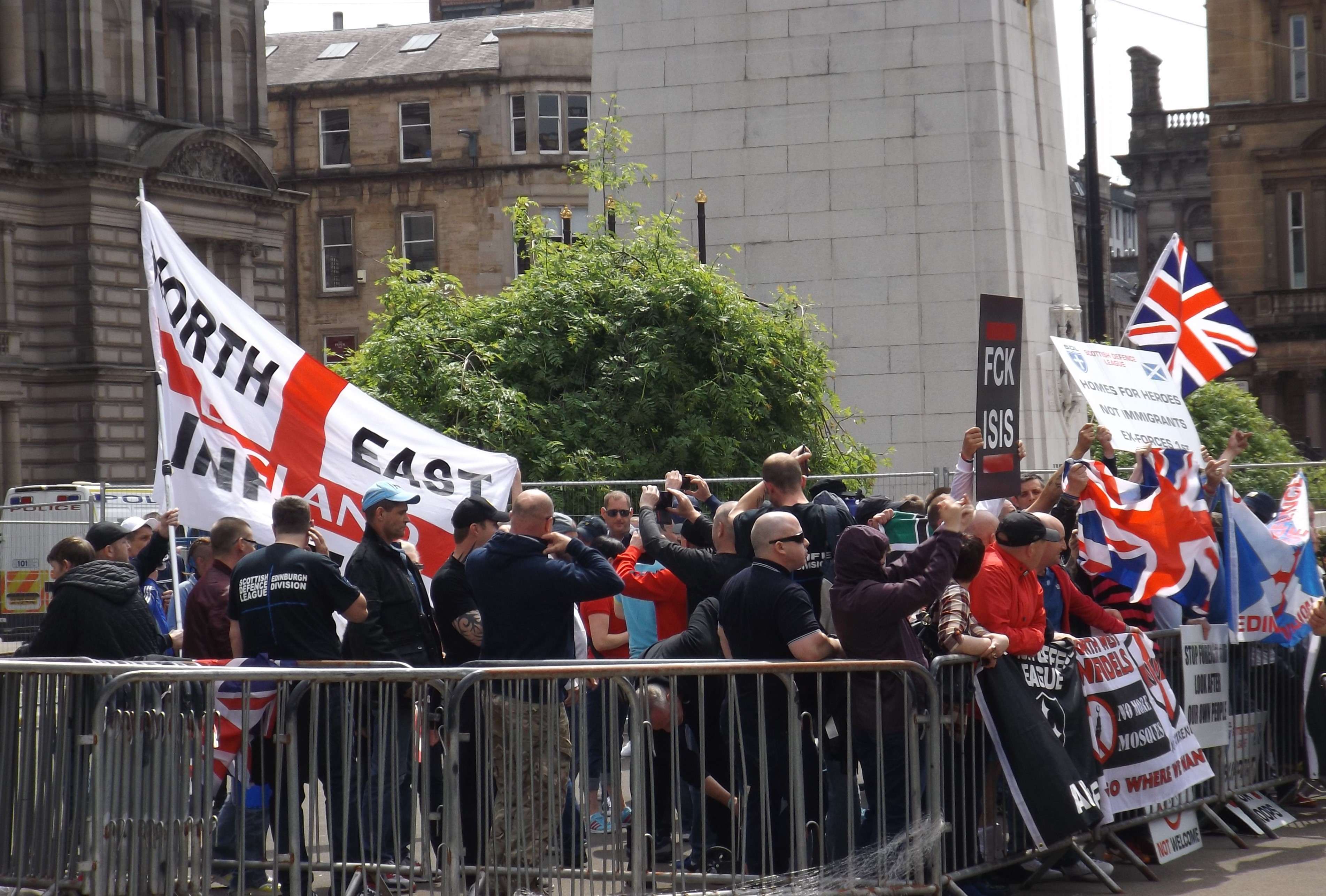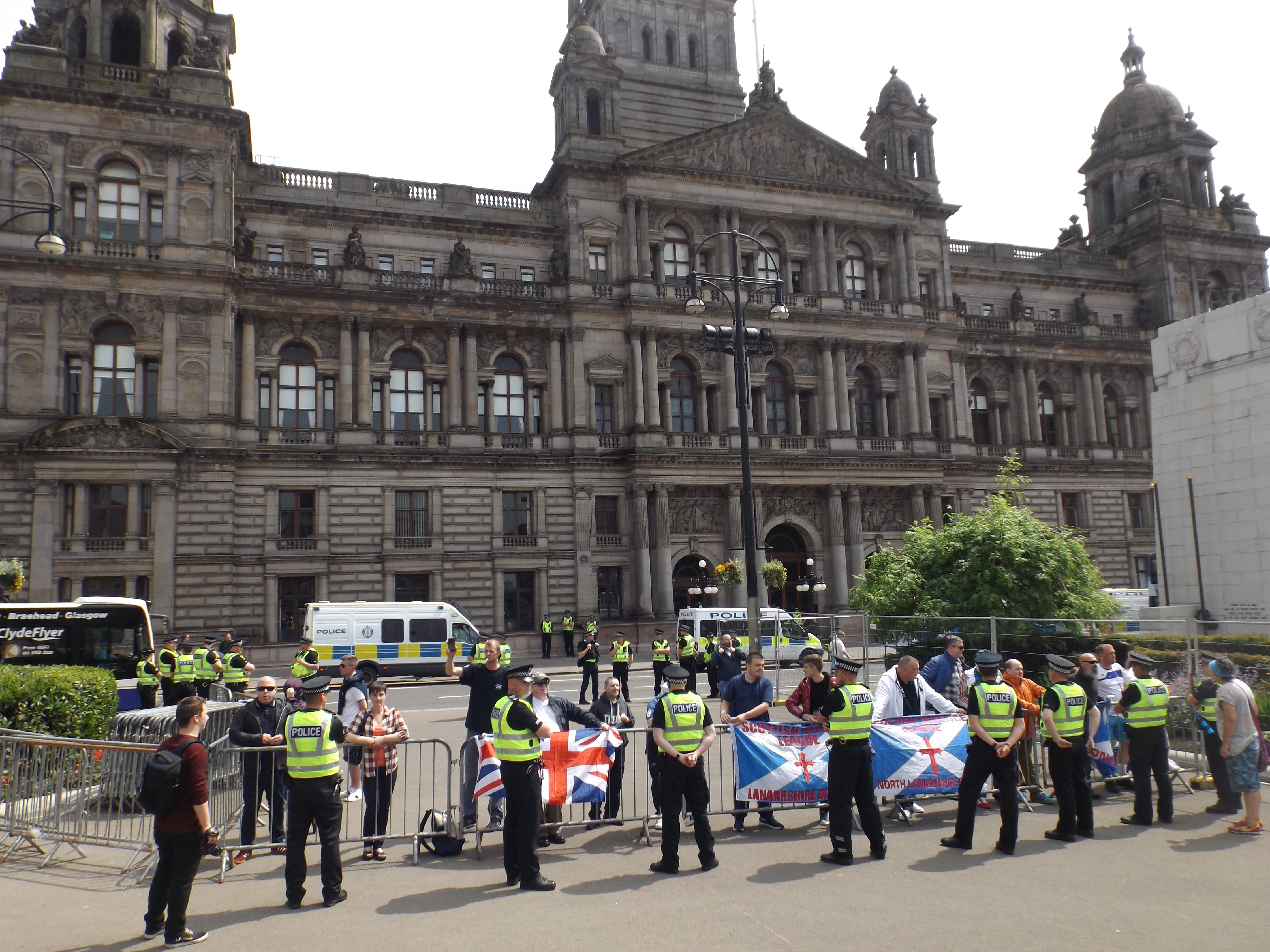A familiar version of events played out in Glasgow city centre this afternoon as blundering far-right fantasists the Scottish Defence League staged a demonstration against – variously – refugees, Islamism, communism, anti-fascism and the European Union. As coherent as ever, this involved a rabble of 40 racists standing in a confined pen in front of George Square’s City Chambers, while a larger crowd of a few hundred anti-fascists looked on.