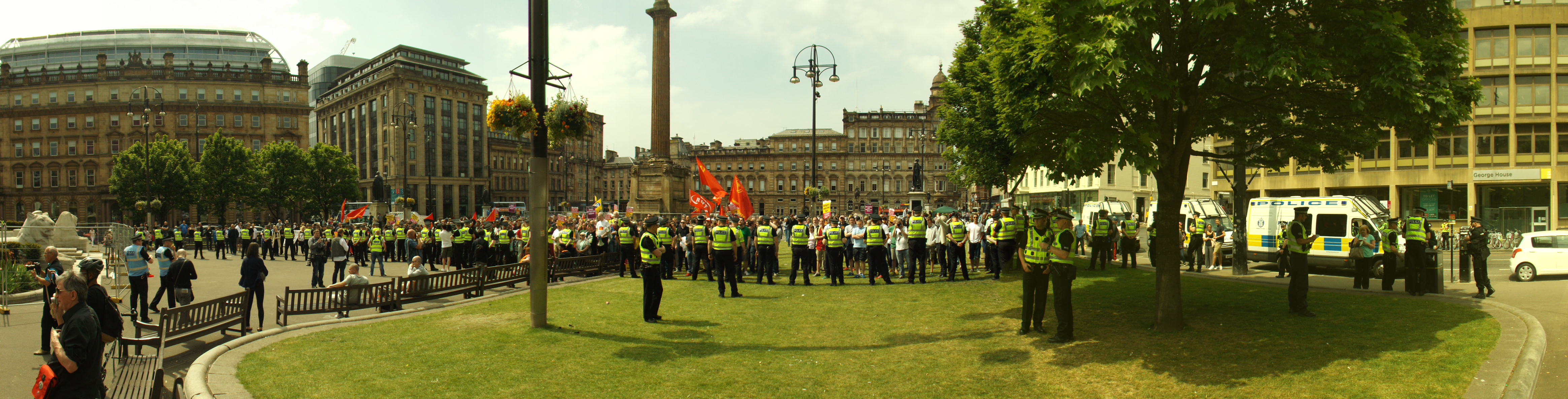 This disconnect was further illustrated when some guy on a megaphone – who seemed to be aligned with an antifa block with syndicalist flags, rather than the main UAF demo – started mouthing off about how the police protect the interests of the rich, and you never see them in “Govanhill and Possil”. The latter point seemed like a strange conclusion; if anything the harassed working class youth of outerlying areas of Glasgow probably got some much needed respite on Saturday, with half the cops in Glasgow instead sitting in vans around George Square.