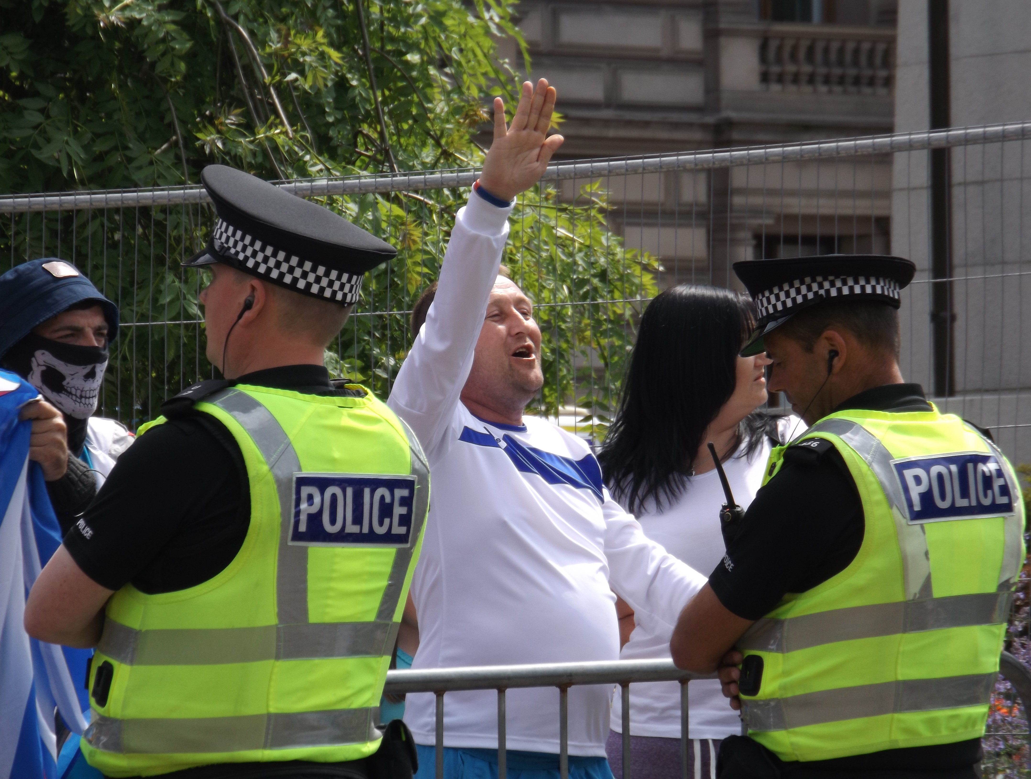 As two SDL supporters tried to start up a (intentionally provocative) chant of “There’s only one Adolf Hitler” as they passed Strathclyde University, one passer-by snapped and had to be held back by his partner. The police rushed over, telling him to calm down because they were just trying to “keep the peace”. How facilitating an unofficial march of 40 fascists chanting inflammatory slogans about Hitler is “keeping the peace” is anyone’s guess.
