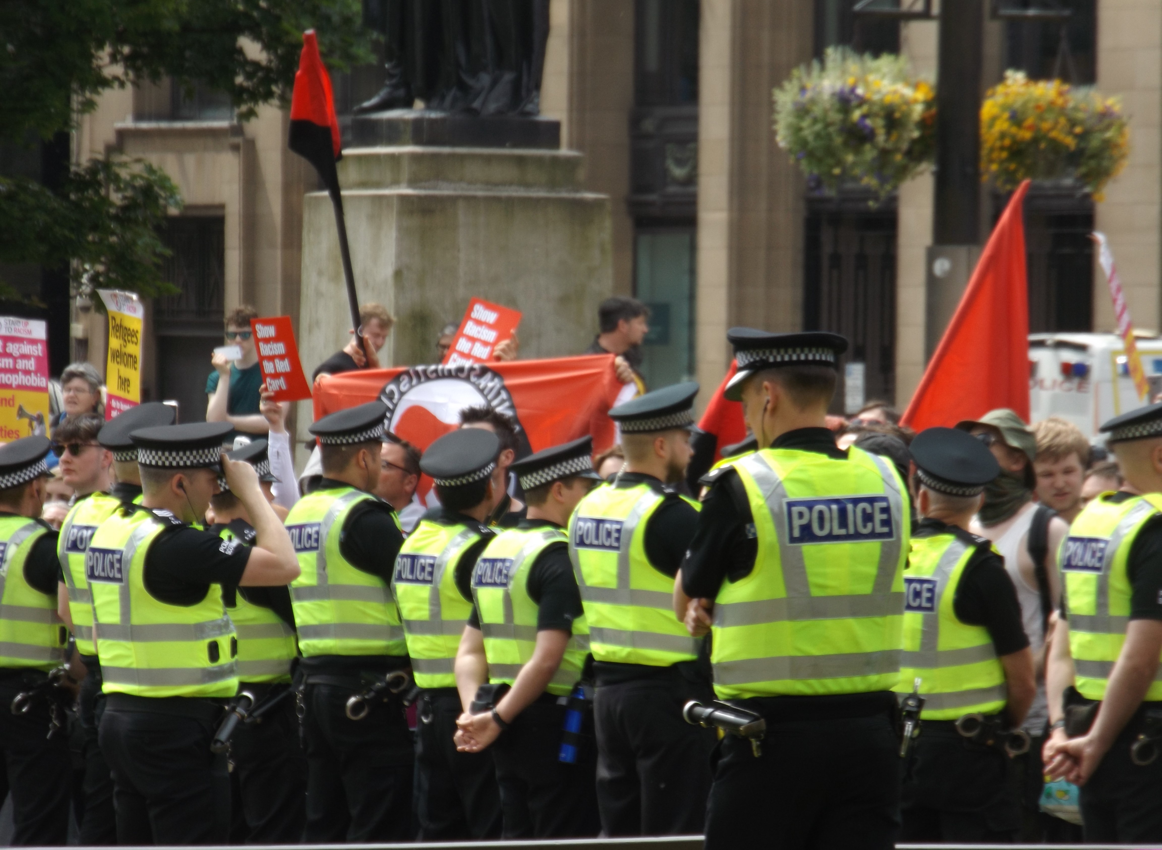 The anti-racist protest, organised by Unite Against Fascism, numbered in the hundreds and was necessary for a number of reasons. It kept the police on edge and meant the SDL were never given much free reign to wander about the square.