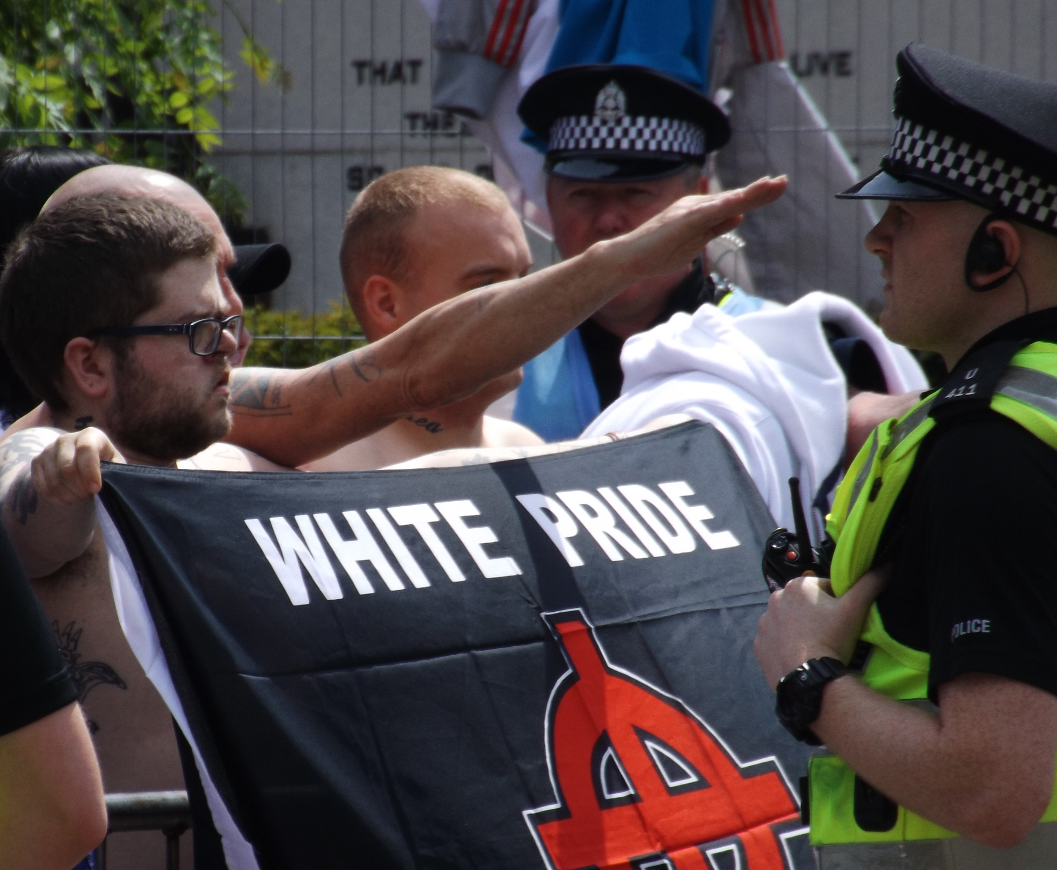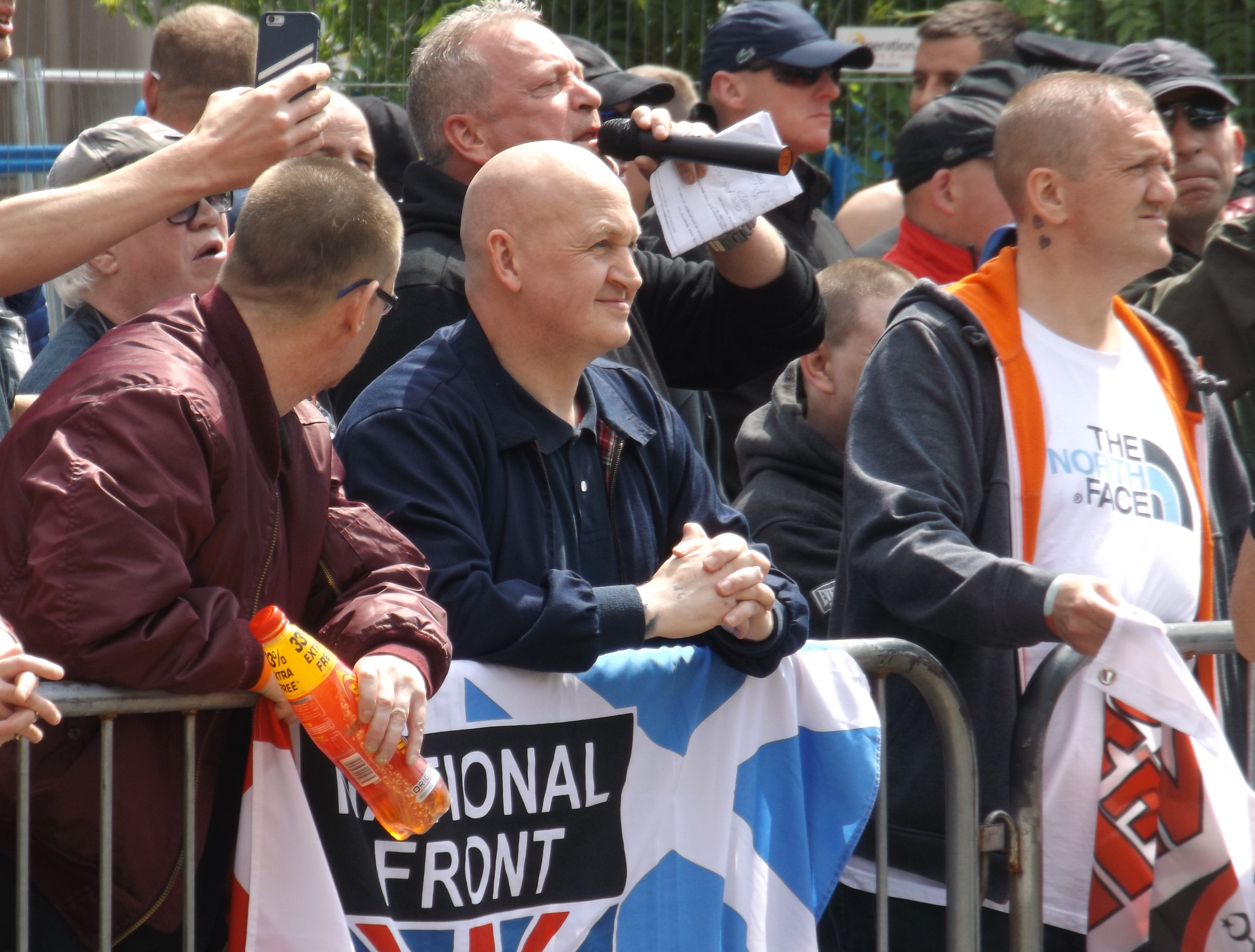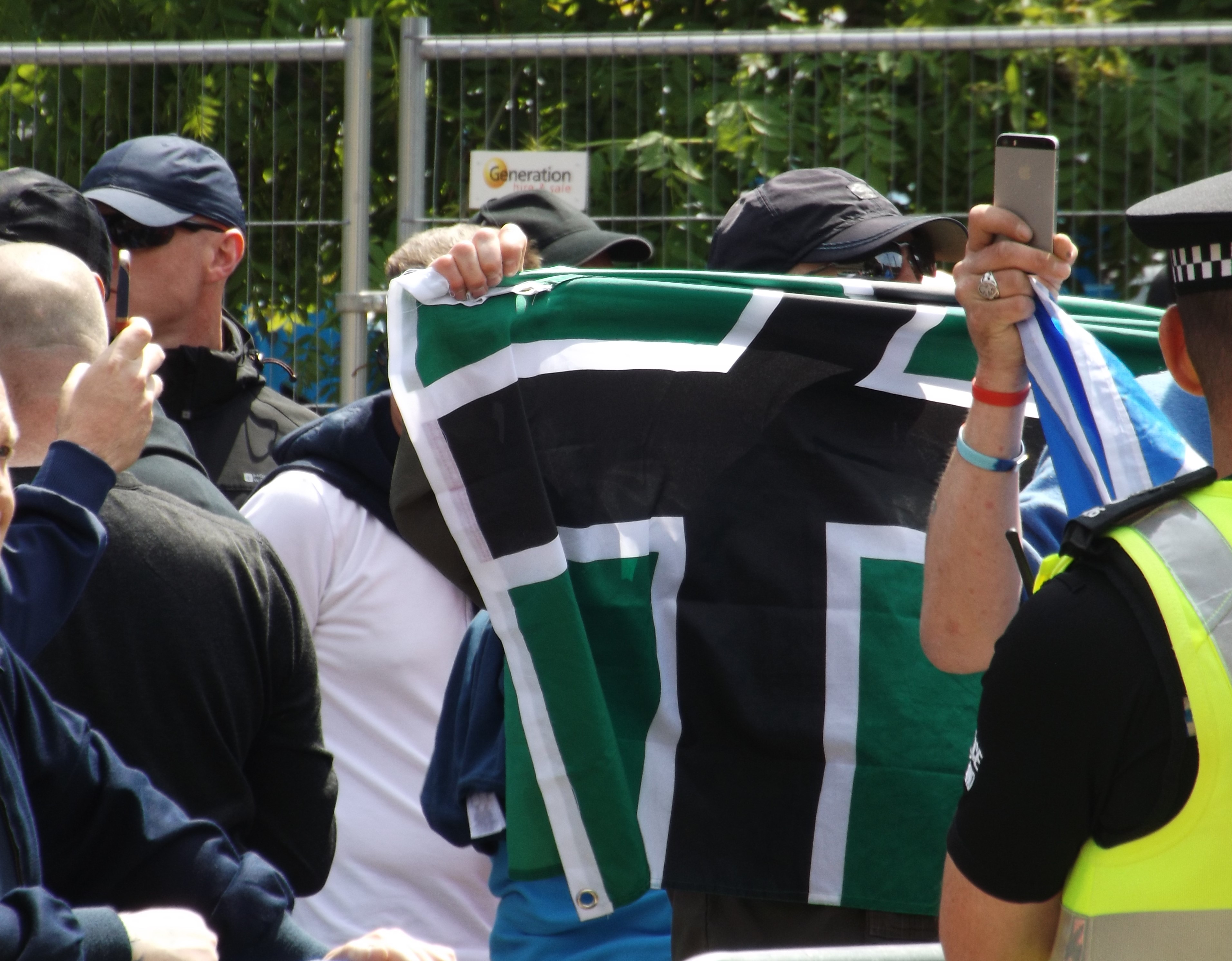 The police weren’t messing about today with over 100 cops and about 8 horses camped out in the square. At first, this was all for about 10 supporters of the SDL. However, numbers were soon boosted by the arrival of various groups of ‘infidels’ – complete with massive England flags – and cultish neo-Nazi youth group National Action. Also in attendance was Dave McDonald, Aberdeen’s most controversial community councillor and the leader of the National Front in Scotland.