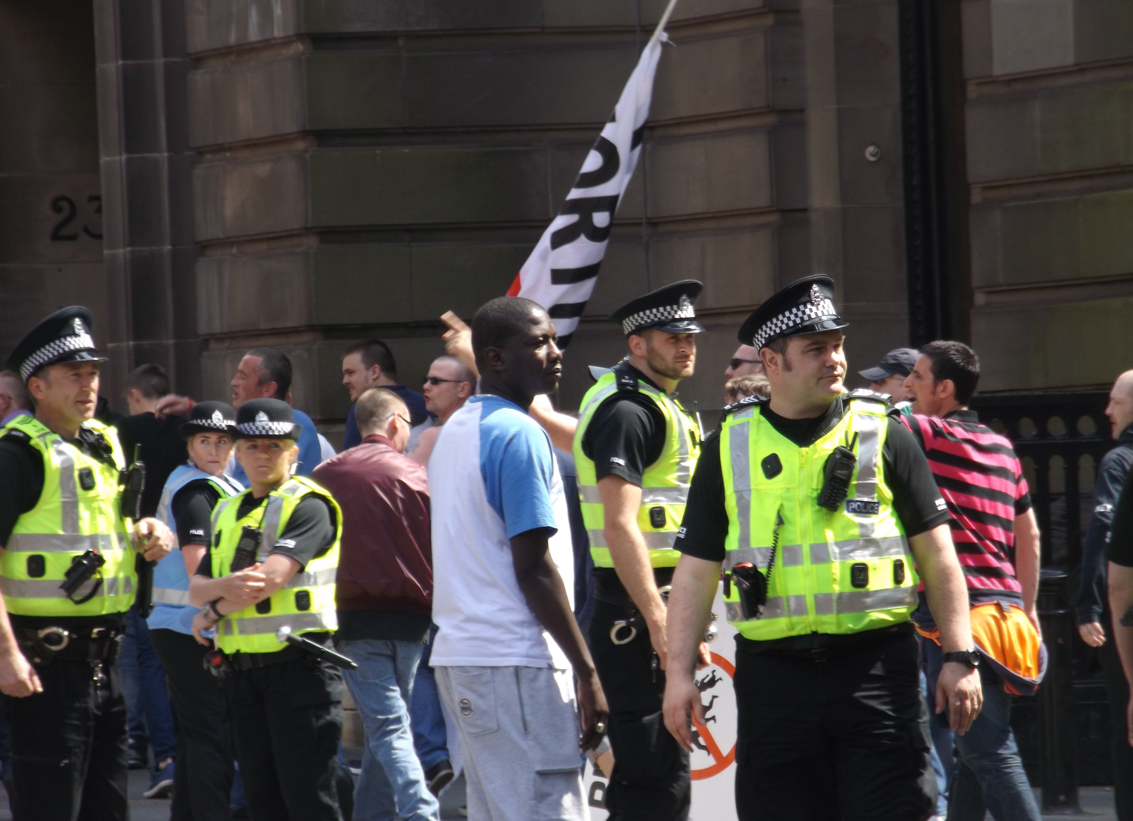 The SDL and their hangers-on (such as local celebrity “EDL Abdul”) were abruptly shuffled out of the square at 1.30pm. It was perhaps premature for anti-fascists to begin celebrating another great victory at this stage, although they did. The group of 40 SDL were moved along the length of George Street, signing Rule Britannia and sieg hailing as they went. Anyone who it looked like the SDL may find vaguely disagreeable (e.g. being from an ethnic minority) was awkwardly pushed off the pavement by the cops, lest they “provoke” the passing fascists.