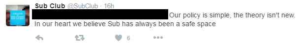 Another Twitter user who put on a night at Sub Club spoke of being reprimanded by staff for posting a safe space policy in advance of their night. How could you possibly think your club is a safe space when members of your staff clearly think it’s a threat to their reputation for a promoter to try to introduce such a policy at your venue?