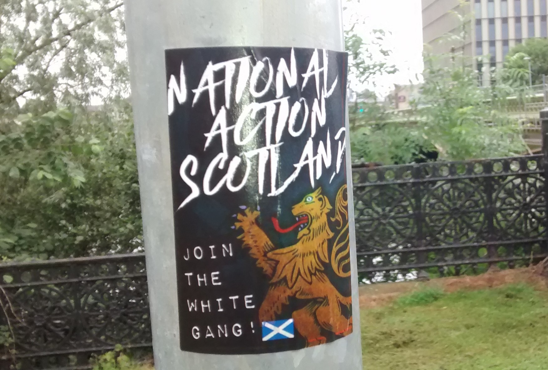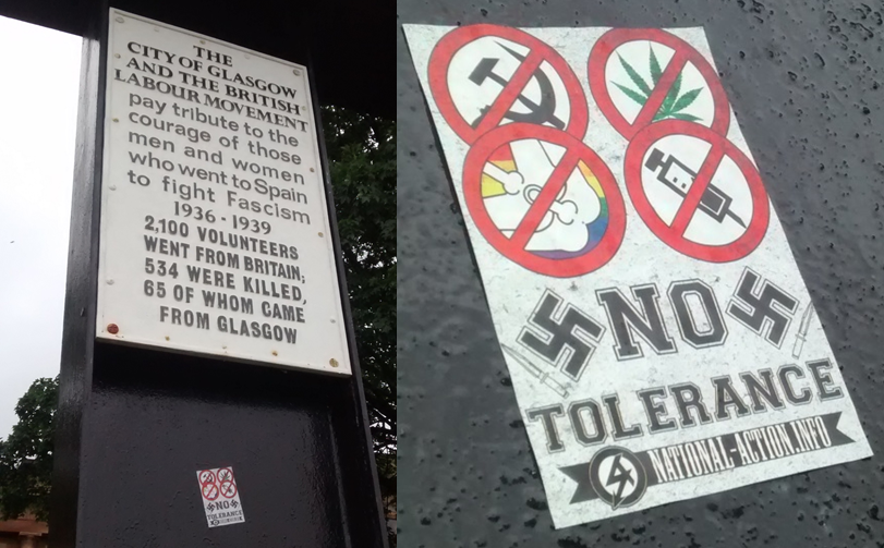 Bigots emboldened by the Brexit vote have plastered lamp posts around the River Clyde and Glasgow Green with neo-Nazi stickers. This afternoon, A Thousand Flowers destroyed or obscured around a dozen stickers in the area, all of them from cultish Nazi youth group National Action. In one instance, a sticker had been attached to the La Pasionaria statue, a tribute to British workers who volunteered to fight fascism during the Spanish Civil War.