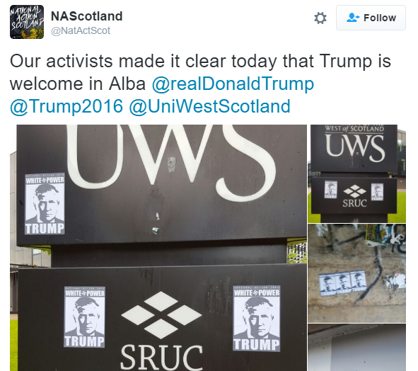 NA are also a pathetic wee bunch of boring bastards, who as well as a fetish for Nazi iconography, are apparently opposed to commies, gays and cannabis. In other words, the arch-fucking-nemesis of this blog. Naturally, NA are also big fans of Donald Trump, marking his visit to Scotland this week by stickering the Ayr UWS campus with ‘WHITE POWER – TRUMP’ stickers.