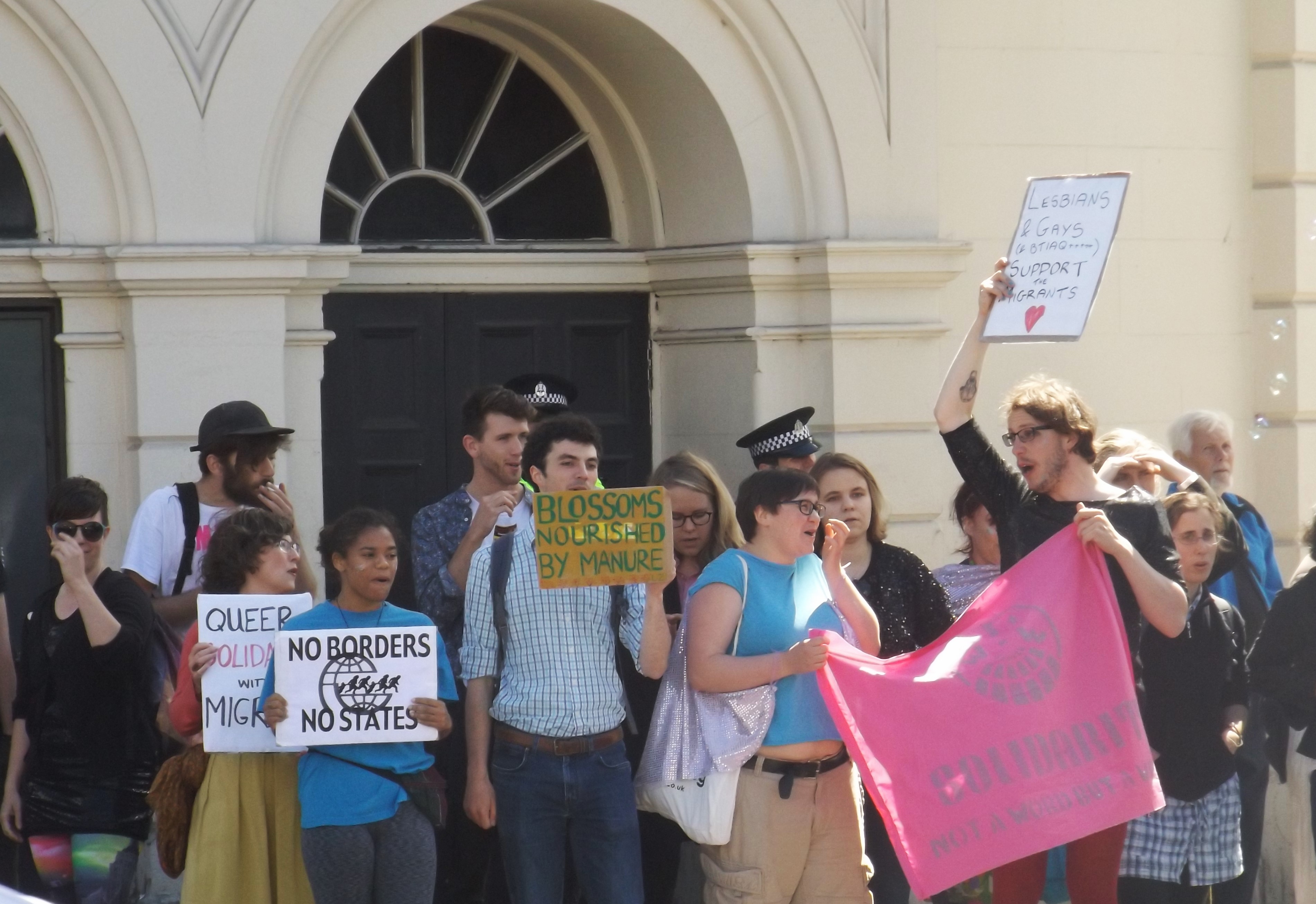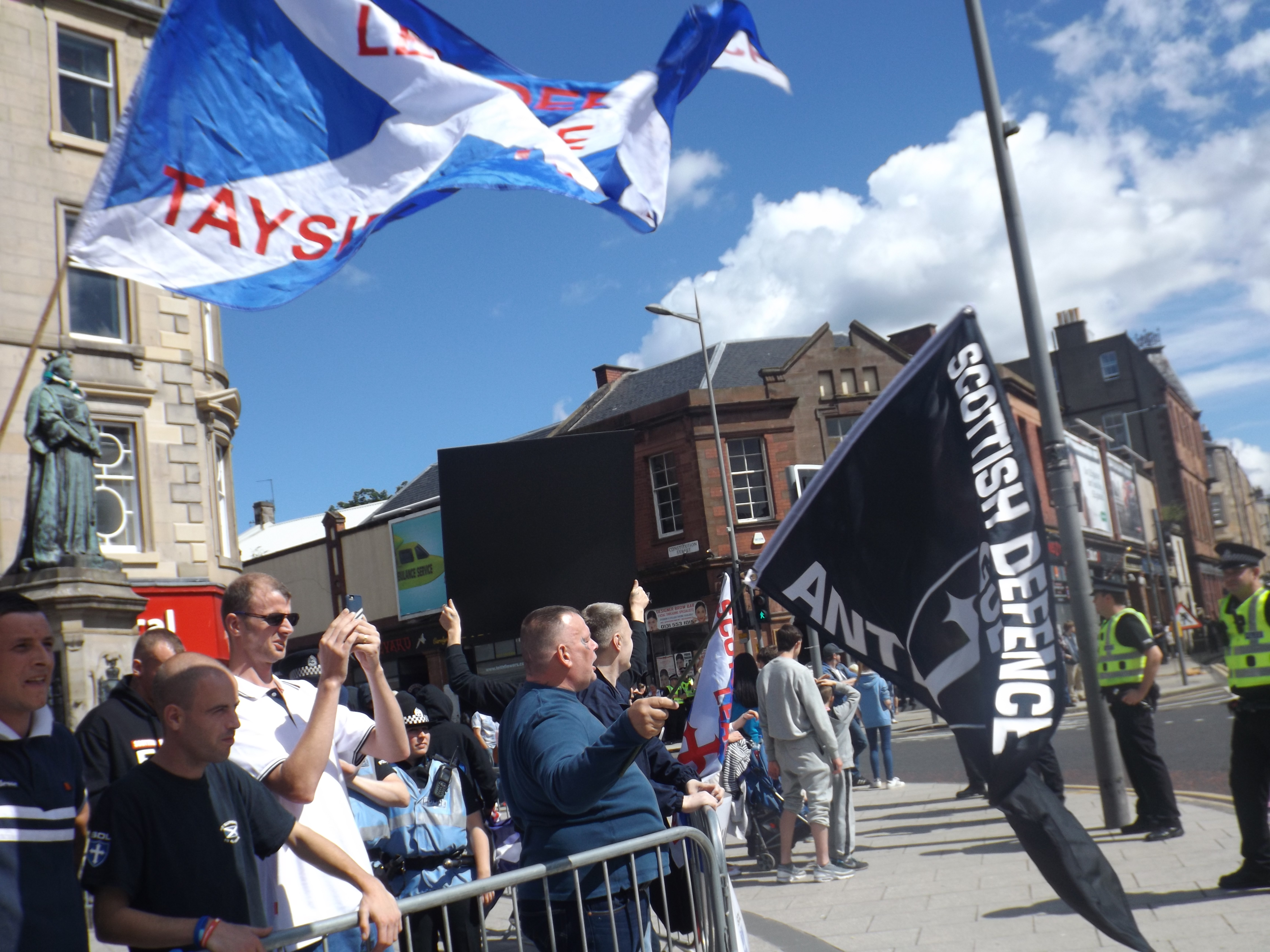 Importantly, the SDL were on the backfoot today, responding to a large community-based initative rather than the other way round. For the fascists, it followed a by now familiar formula in which they work with the police to facilitate a demo for a certain period of time. The SDL seem comfortable with this set-up for now – their wee day out in a city centre every couple of months enough to keep their core base of supporters happy. As for National Action, their main guy spent most of the demo mouthing off about the lack of respect for their democratic rights. When it was pointed out to him that he is a fascist who doesn’t believe in democracy, he could only agree.