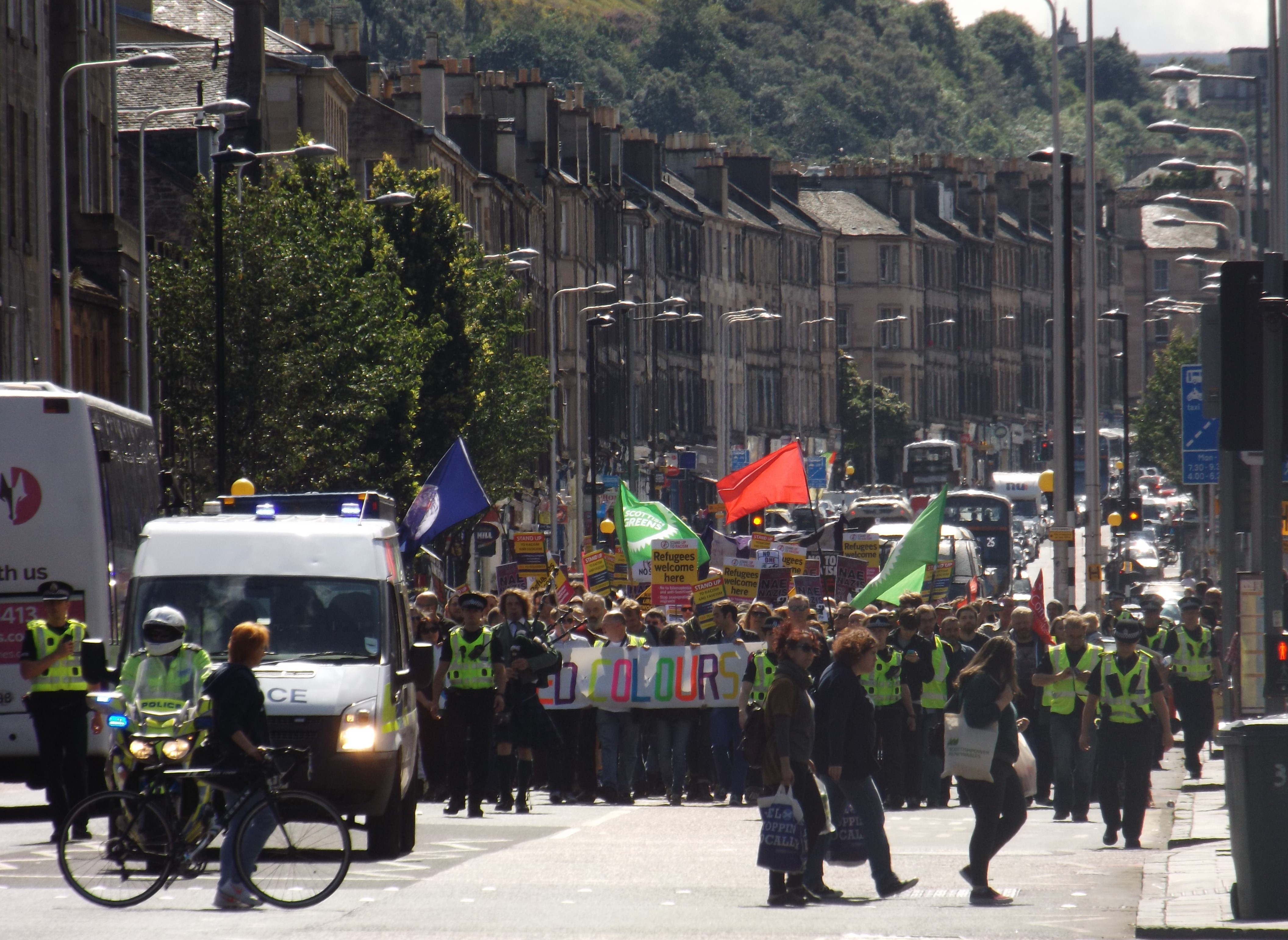 A few weeks ago, stickers from the neo-Nazi youth cult National Action started appearing around the streets of Leith, as they have in Glasgow and elsewhere. In response, locals came together to organise the United Colours of Leith march earlier today – a show of defiance against the racists from one of Edinburgh’s most multicultural areas. Around one thousand people marched between Pilrig Park and Leith Links, bringing the road to a standstill.