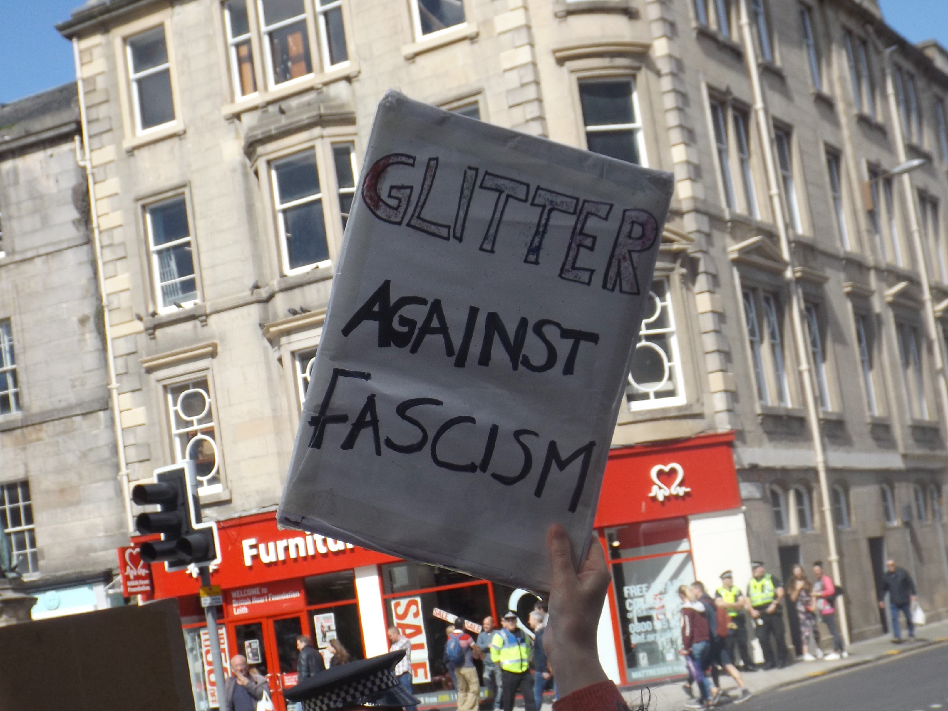 Unfortunately, a small group of fascists were also out in Leith today, with the Scottish Defence League calling on their supporters to oppose the demo. A rabble of 20 fascists gathered in a police pen at the foot of Leith Walk. What the SDL didn’t count on though, was Glitter Against Fascism. A call-out for an anti-fascist bloc of LGBT+ people and allies wearing “their most glorious and glittery outfits in brave defiance of fascist hate” saw the SDL get increasingly wound up by a constant anti-fascist presence during their 45 minutes or so on Leith Walk.