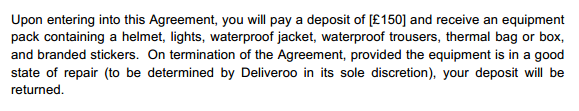 Deliveroo makes clear in the contract that it is exempt from employee rights legislation, as the firm considers its workers to be self-employed contractors, with no entitlement to sick pay, maternity leave, paid holiday or other legal protections. Despite this alleged self-employment, the drivers are compelled to wear a uniform and abide by a lengthy code of conduct. Worse still, they need to pay for the uniform and other working equipment themselves, stumping up £150 for  clothing, the delivery box and “branded stickers”.