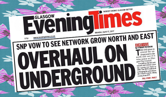 This time, it’s the underground network which is making headlines, following the revelation by the Evening Times that the SNP – if, as expected, they assume power in the City Chambers on 4th May – will look at “possible extension of the Subway” into the north and east of the city. And indeed, the party’s Glasgow manifesto says much the same thing – that they will “look favourably” on opportunities to expand the underground from its existing set-up that, since its opening 120 years ago, has only covered a small circle around the city centre.