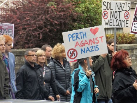 But a combination of factors was able to prevent that in Perth on Sunday. The build up to the day had made it clear the SDL have no local support in Perth (although the same is true everywhere), there was strong opposition from the local press and politicians – indeed, the local MP, Pete Wishart, who attended the counter protest – and there was a good turnout of around 500, more than has been managed recently in far larger cities. Importantly, anti-fascists also embraced a diversity of tactics on the day, ensuring that all did not go as planned for the SDL. Nor did things really go entirely as planned by the police either, despite the huge number of officers (easily over 100) present on the day, who – let’s remember – usually feel compelled to facilitate the SDL no matter the circumstances. On Sunday, the circumstances were that the SDL were protesting about a new mosque due to be built in Perth.
