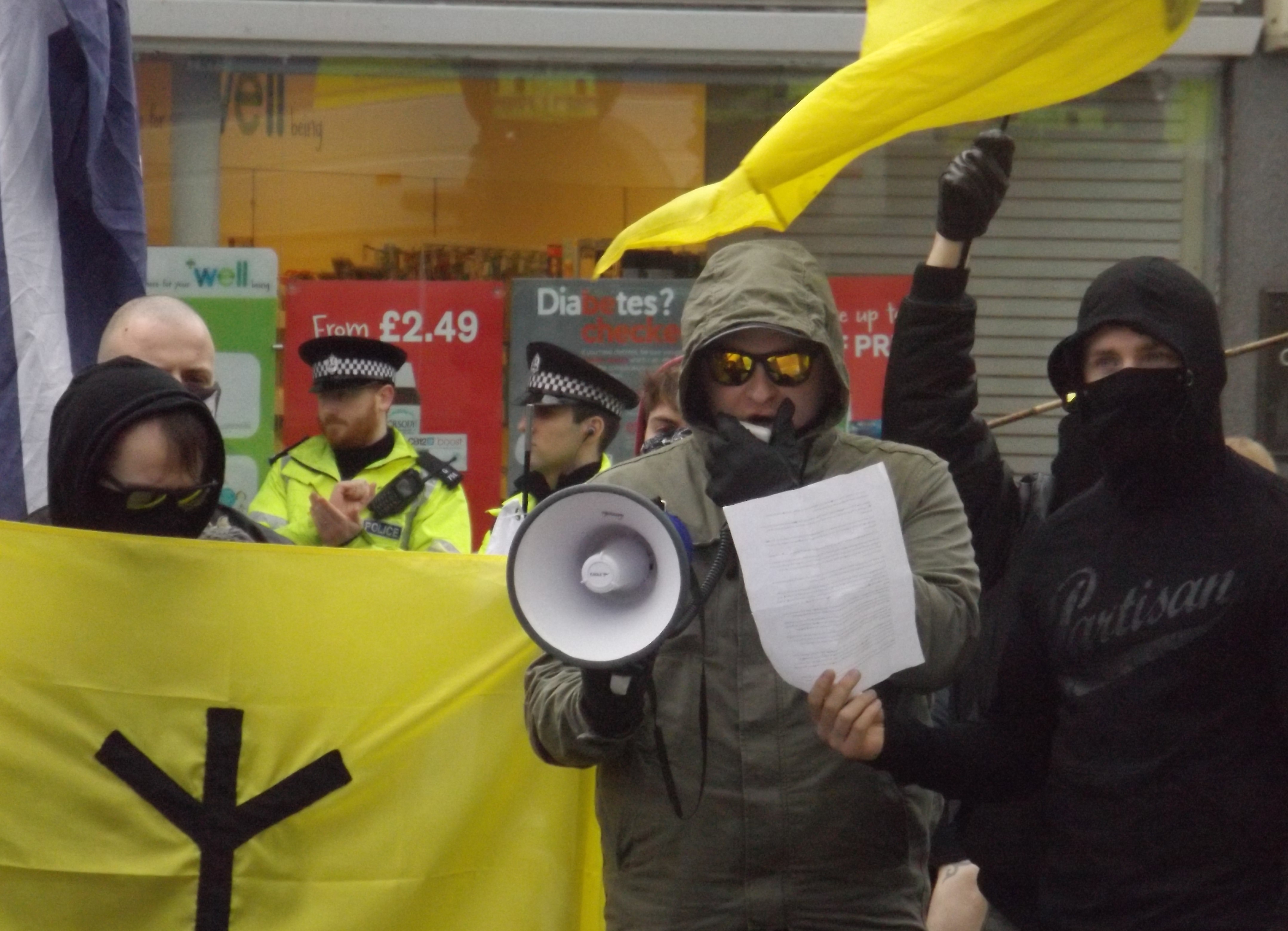 Neo-nazi group National Action were themselves banned in December last year, following their glorification of the death of Labour MP Jo Cox, becoming the first ever far-right group to be banned in the UK under terrorism laws. When similarly dressed figures began organising under the name “Scottish Dawn” earlier this year, first appearing with distinctive yellow runic flags at a Scottish Defence League demonstration in Alloa in March, it was suspected that they were the same organisation under a different guise, as we reported in our write-up from that day. But those fears were later confirmed by investigative site The Ferret, who sent a reporter undercover with the group. In secret recordings, their organisers admitted working with former-NA members. This then culimated in the Home Office banning the group on 28 September.