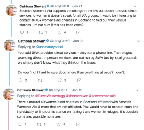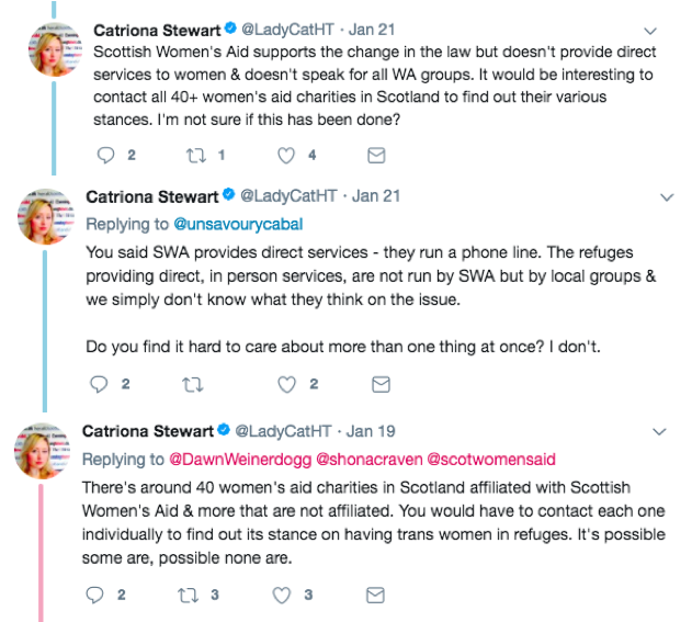 Catriona ‘We Simply Don’t Know’ Stewart is a senior journalist at the Herald & Times Group. To me that means she’s got a fancy desk, a big salary and every contact under the Scottish not sun at her fingertips. But rather than try and find out so she didn’t give ground to the misrepresentation of services and instill fear in women who might need to one day present at their local Women’s Aid and might also be trans, she sent a pointed and scary tweet, then logged out. Brass neck points for pulling us up for not speaking to individual services, while choosing to imply something more than a bit dodgy without… speaking to individual services. (Just ring them, Catriona, and if you can’t be arsed surely there’s an underpaid intern somewhere who’s fed up shredding Iain Macwhirter’s draft novellas).
