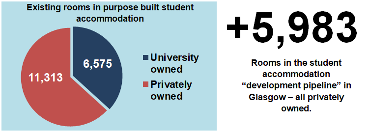 In December 2016 it was estimated that there were 7,706 rooms in privately owned purpose built student accommodation in Glasgow. That number has now climbed to 11,313, signifiying growth of 47 percent in just one year.