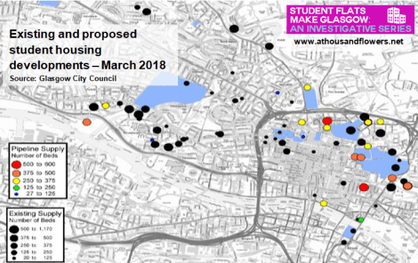 The full scale of the new developments in shown in the coloured dots on the below map, recently produced for the council as part of research commissioned from the estate agent Savills. The map shows the 5,983 new rooms spread across 19 developments, most of them shown clustered around Strathclyde University.