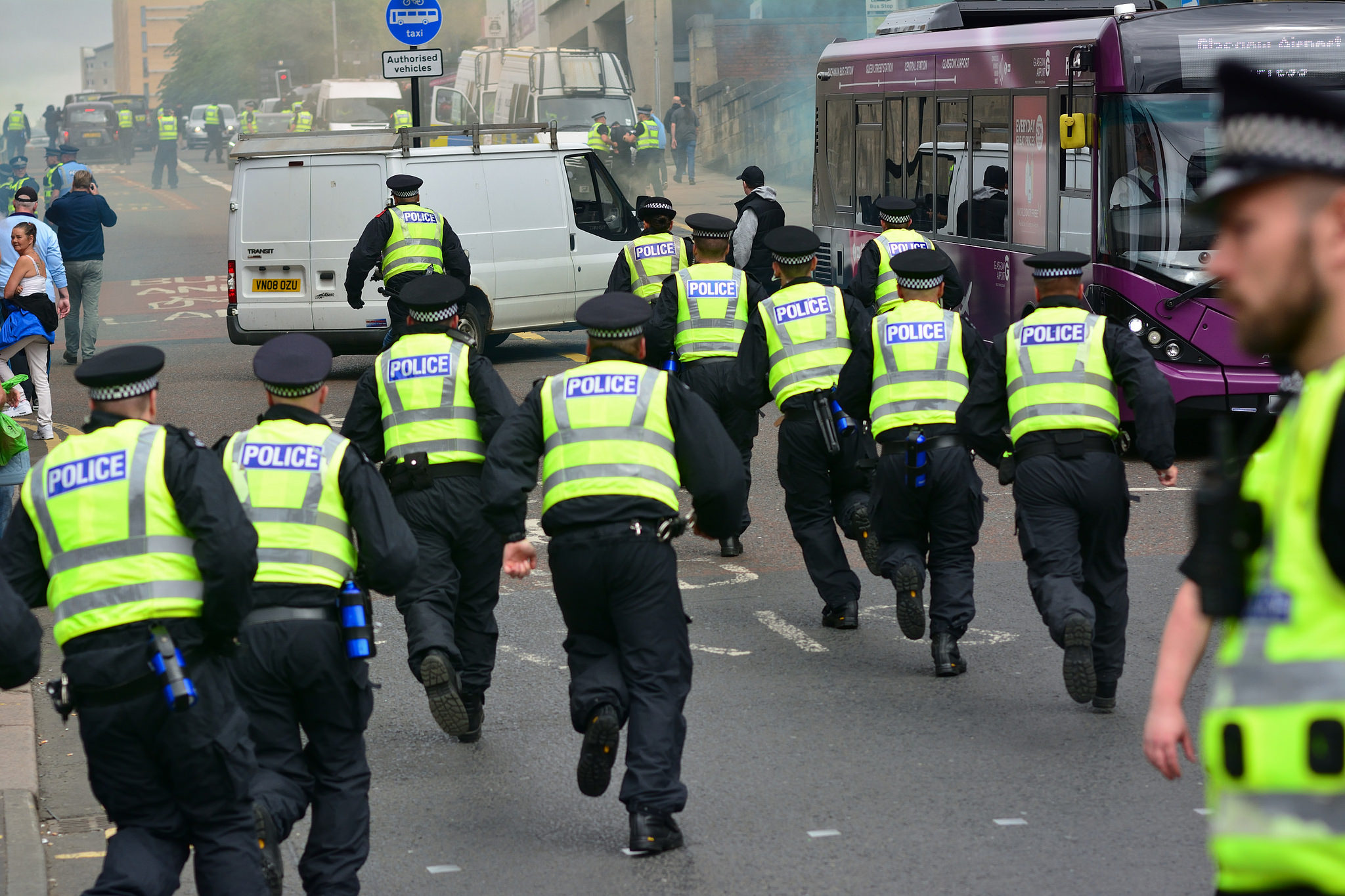 Today was no different – there was a huge police presence. With much of George Square closed off for works to build a stage for the upcoming European Championships, the Cenotaph separated a typically tepid Unite Against Fascism demonstration from the SDL’s designated area. The police, however, had likely not counted on there being sizeable groups of anti-fascists that remained outside of the ‘kettle’ and kept mobile. This resulted in the SDL being ambushed at their assembly point and pelted with smoke bombs, as well as later skirmishes around the city centre.