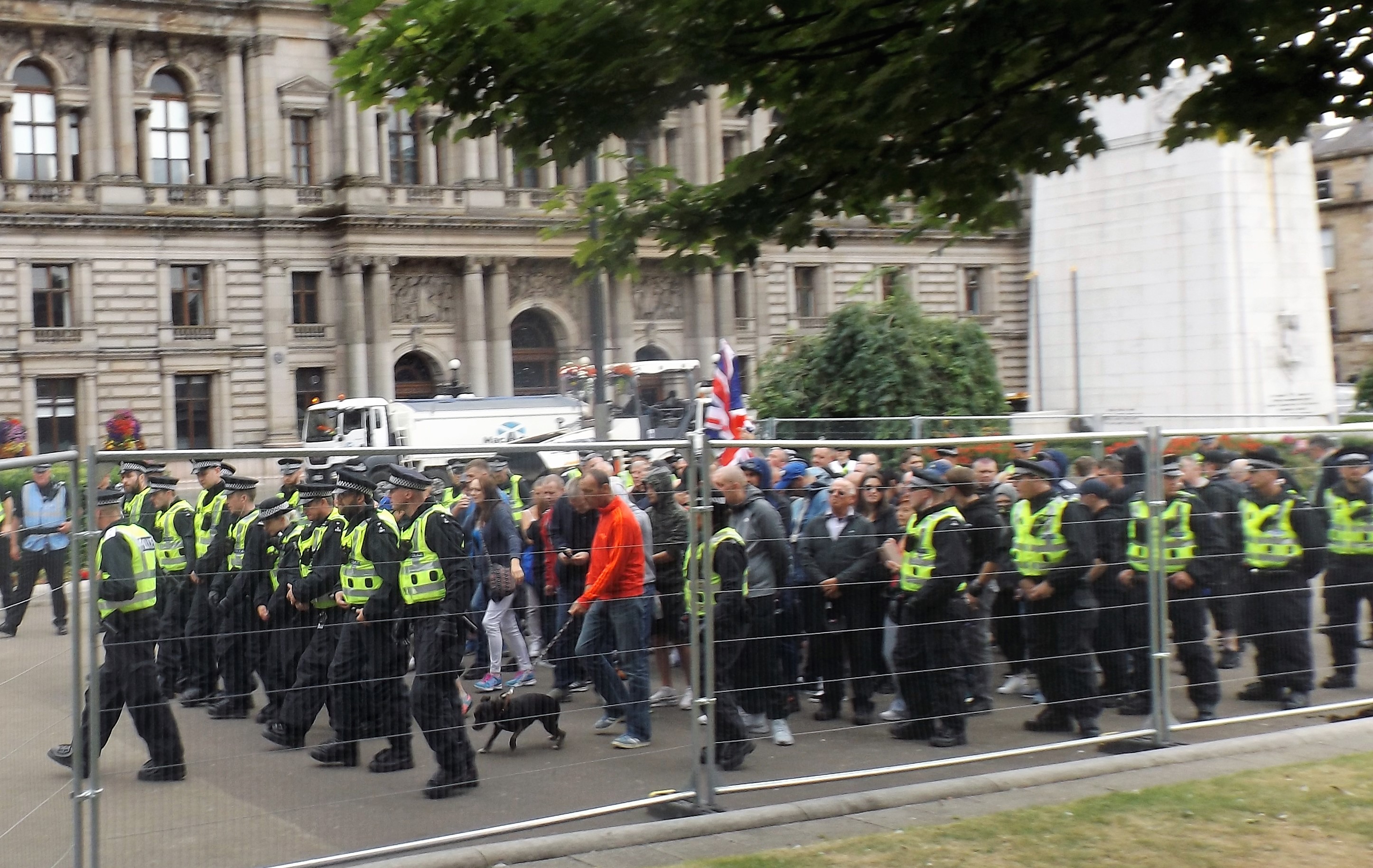 As it turned out, today was much like all of their other demonstrations: a few dozen far-right veterans and schoolboy fascists gathered before being marched to their designated protest area, posing for some photos and a few garbled speeches, before an enforced return march and dispersal. There were likely others in the vicinity of George Square who had come with the intention of joining the SDL, but were put off by the heavy police presence that surrounded them at all times.