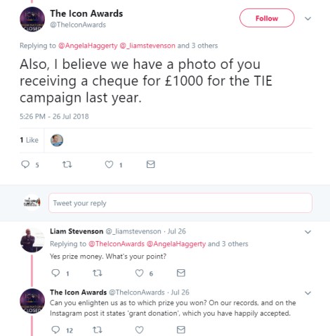 Whether that was a veiled threat or an attempt to implicate TIE in their own nonsense, who knows but anyway, TIE said the Icon Awards could have their money back. When Stevenson pointed out the £1000 TIE had received was prize money, the response was even more bizarre, “Can you enlighten us as to which prize you won? On our records, and on the Instagram post it states ‘grant donation’, which you have happily accepted.” Perhaps if the Icon Awards had checked their Twitter records, they may have spotted the congratulations they offered to TIE last year. Double congrats, for those keeping scores.