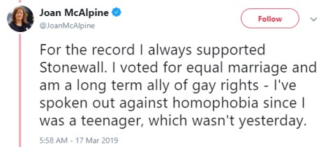Joan McAlpine didn’t rest at slagging off women’s groups, not when there are those pesky gays to be ripped into too. Stonewall were also in the McAlpine firing line, as an LGBT advocacy group who… have belatedly started supporting the T. You may remember trans people from stuff like… Stonewall. Of course, Joan was keen to show off her Gay Credentials, declaring herself an “ally” based on support for Equal Marriage, which seems to be the new “some of my best friends are…” defence, used by not homophobes.