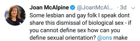 So the answer is they now wouldn’t be able to accurately complete the census as non-binary people had asked to be able to, since Joan’s worked to ensure the non-binary option doesn’t exist. Also, they don’t live in Scotland so they’re unlikely to have had much impact on the integrity of Scottish census data that Joan’s apparently so keen to safeguard, but why let that get in the way of ripping into a random queer person? Not content with using her role as Committee Convener to harangue a trans person, she then tagged them in a Twitter thread. The targeting of someone who isn’t even a resident of Scotland, solely because Joan doesn’t want them to be able to accurately complete a census in a country they don’t live in anyway, is atrocious bullying which shouldn’t be tolerated in a playground, never mind a Parliament.