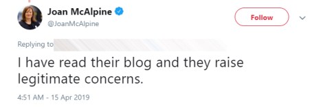 Transgender Trend also promote “conversion therapy”, or to give it it’s accurate name, the torturing of trans people. Of course, none of this stopped Joan McAlpine from breathlessly sharing their nonsense about The Bad Transes Being A Threat To Kids on Twitter. When Joan was challenged on this by a journalist, specifically on whether she endorsed the torture of children for being trans, she tried to dodge the question of what and who she was promoting, by pulling out the Bigot Top Trumps: LEGITIMATE CONCERNS.