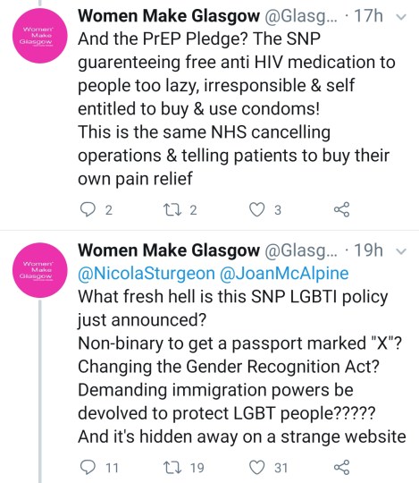 If any evidence was needed that the anti trans panic quickly seeps into open homophobia and biphobia, it’s “Women Make Glasgow”.  Obviously, her speech mentioned how LGBT clubs in schools were bad which is what we’d expect from someone who’s notoriously bigoted towards LGBT people.  Just not what you’d expect at a group alleging to be about LGB rights.